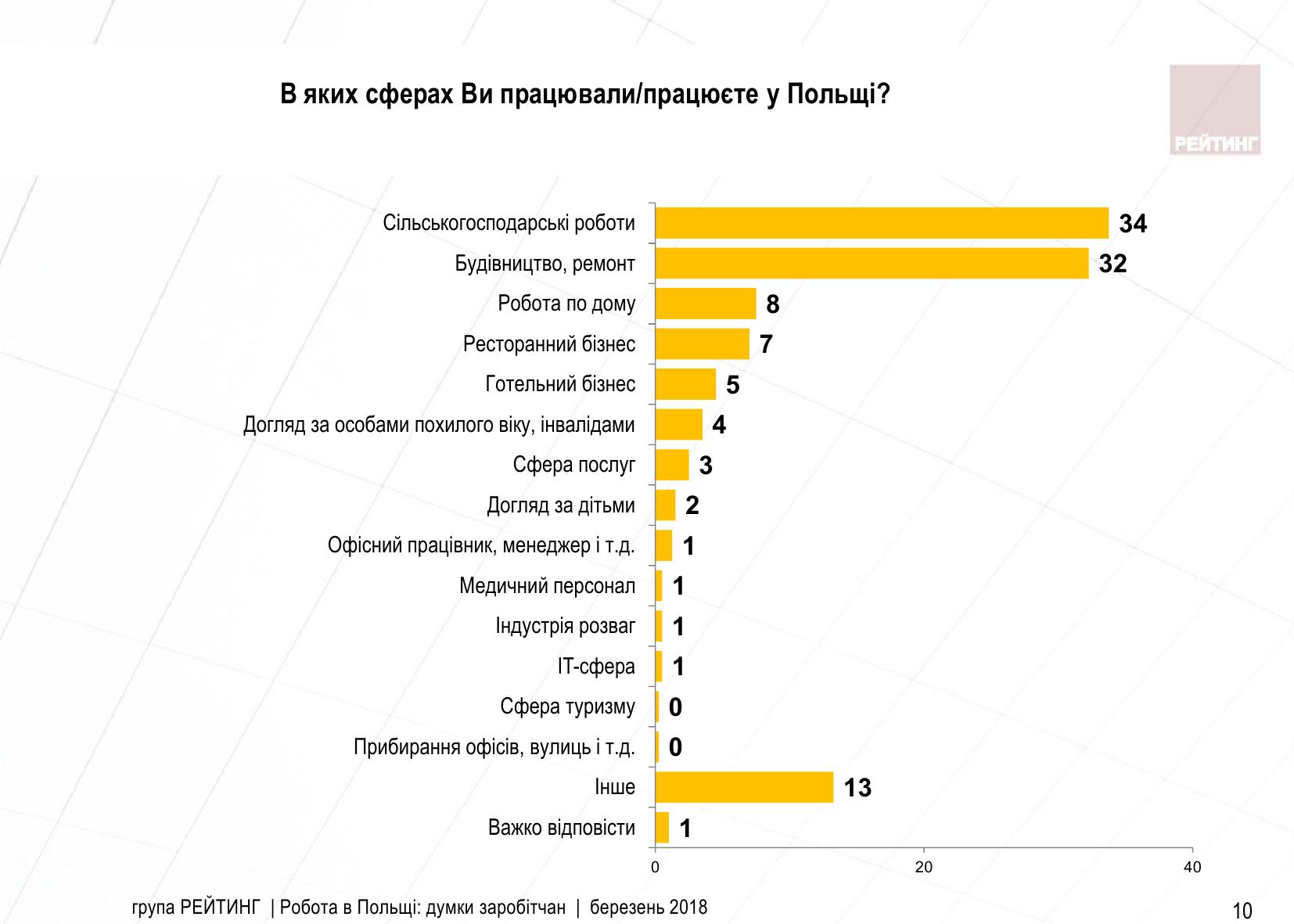 34% працювали у Польщі на сільськогосподарських роботах, 32% - у будівництві, ремонтних роботах. 8%, виконували роботу по дому, 7% - працювали в ресторанному бізнесі, 5% - у готелях, 4% - доглядали за людьми похилого віку, інвалідами, іншими видами діяльності займалися 3%, працювали в сфері послуг менш 3% опитаних.