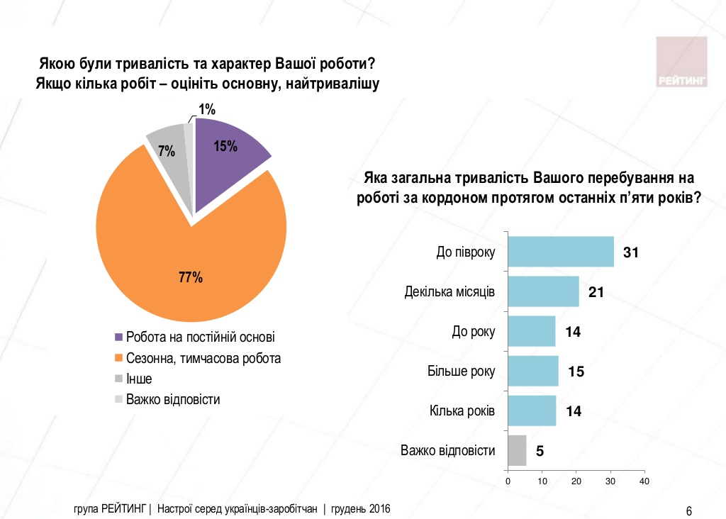 Третина опитаних працювали за кордоном у цьому році, чверть - у минулому році, в той же час, кожен п'ятий - 5 років тому. Майже третина (31%) перебували на роботі за кордоном близько півроку, 21% - кілька місяців, 15% - більше року, по 14% - до року або кілька років, 5% - не дали відповіді на це питання.