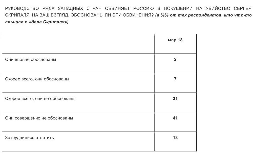 Тільки кожен десятий опитаний, що знає про "справу Скрипаля", вважає звинувачення, висунуті керівництвом країн Заходу проти Росії, обгрунтованими.