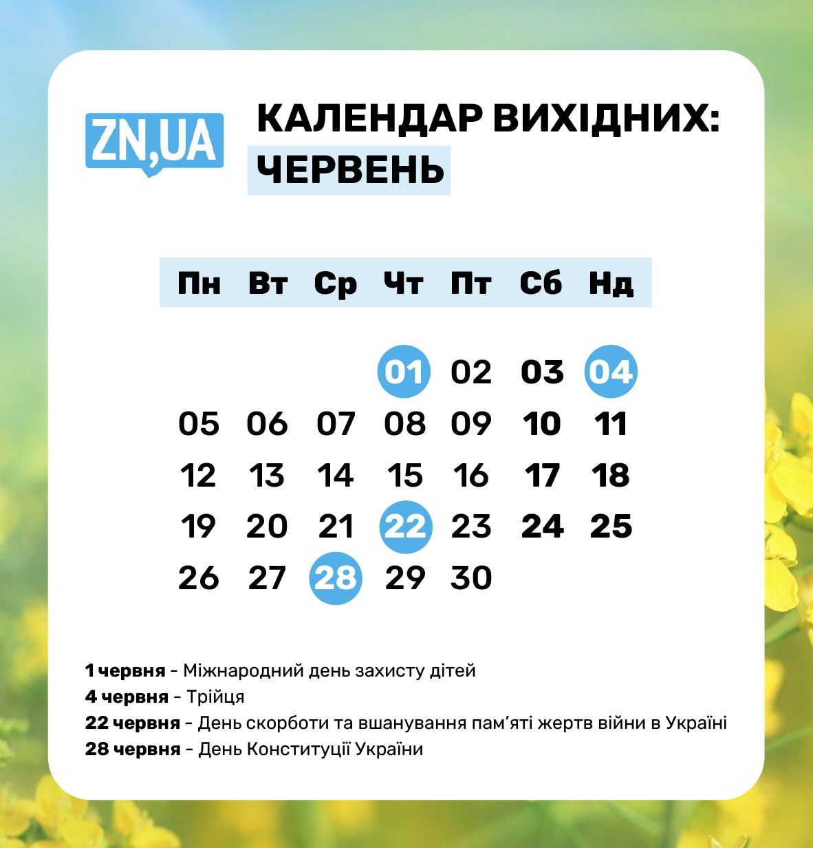 Тому українці відпочиватимуть традиційно у суботу та неділю: 3, 4, 10,11, 17, 18, 24, 25 числа. Загалом у червні буде вісім вихідних днів.