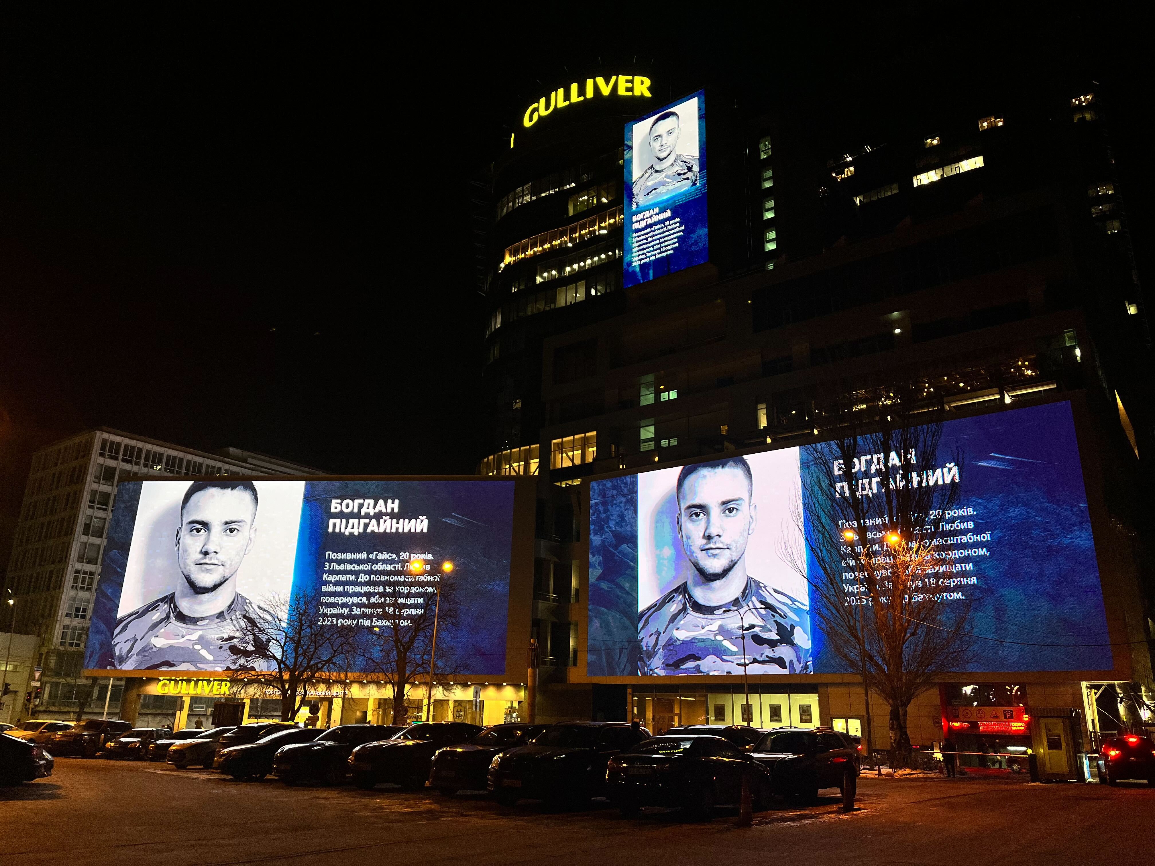Платформа пам'яті Меморіал домовилась про співпрацю із ТРЦ Gulliver – кожного дня на екранах торгово-розважального центру будуть показувати ролик про трьох військових, які віддали своє життя, захищаючи Україну.