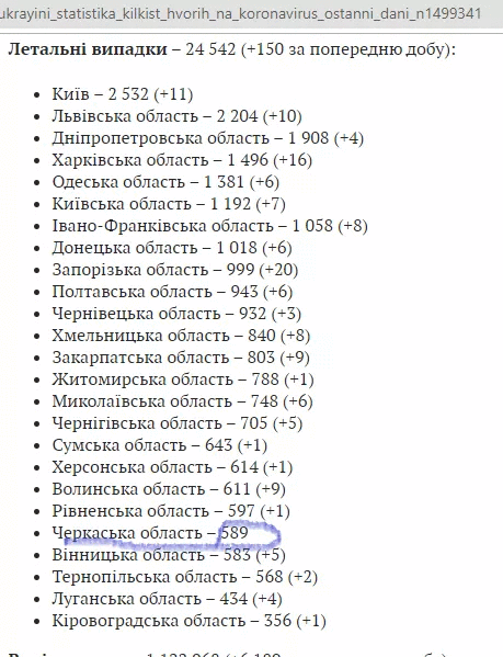 У Черкаській області за весь час пандемії коронавірусу зі статистики, яка стосується летальних випадків, зникли відомості про смерть 142 пацієнтів. Принаймні про це свідчить різниця в даних на сайті ОДА Черкас та відомостях, які публікує Міністерство охорони здоров'я.