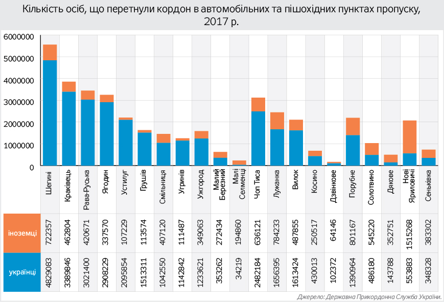 "Згідно з даними ДПСУ, серед осіб, які перетинали кордон між Україною та Польщею, Угорщиною і Словаччиною у 2017 році, громадяни України становили більшість, тоді як на кордоні з Румунією іноземців було майже стільки, скільки й громадян України. Тим часом на кордоні з Білоруссю іноземці перетинали кордон у двох досліджуваних пунктах пропуску удвічі частіше, ніж українські громадяни", - зазначають експерти.