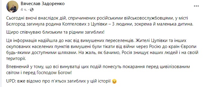 "Сьогодні вночі внаслідок дій російських військовослужбовців у місті Бєлгород загинула родина Коптелових із Цупівки - 3 особи, у тому числі й маленька дитина. Ця інформація надійшла до нас від вимушених переселенців. Жителі Цупівки та інших окупованих населених пунктів були змушені втекти від війни через Росію у країни Європи будь-якими доступними шляхами. На жаль, як бачимо, Росія знищує наших людей і на своїй території", - розповів Задоренко у Facebook.