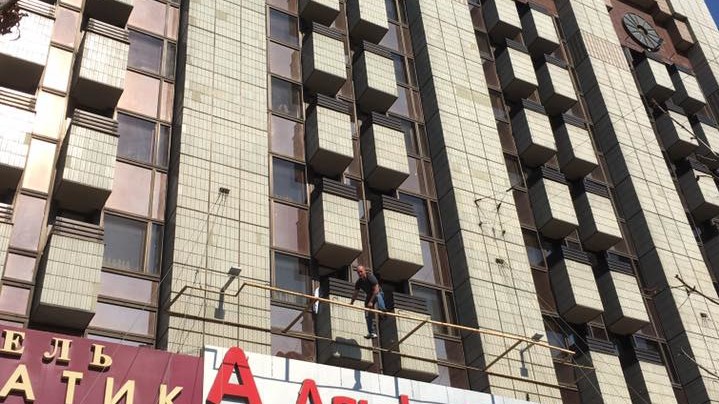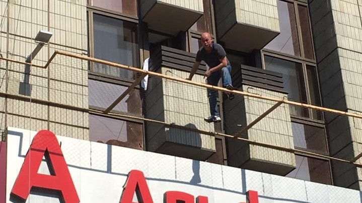 Невідомий чоловік погрожує викинутися з третього поверху будівлі готелю "3", вимагаючи, щоб до нього з'явився російський генконсул.