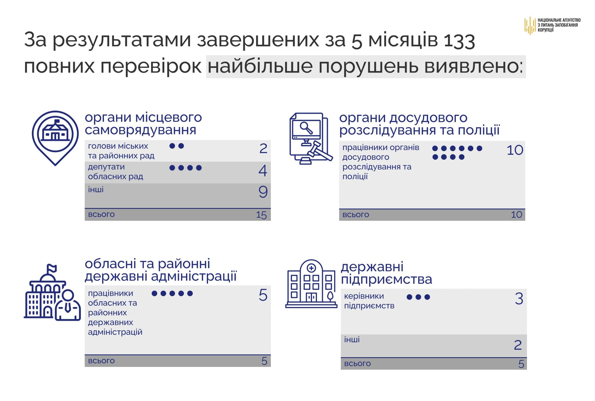 За результатами повних перевірок за 5 місяців, найбільшу кількість ознак правопорушень щодо декларування виявлено у представників органів місцевого самоврядування – 15 осіб.