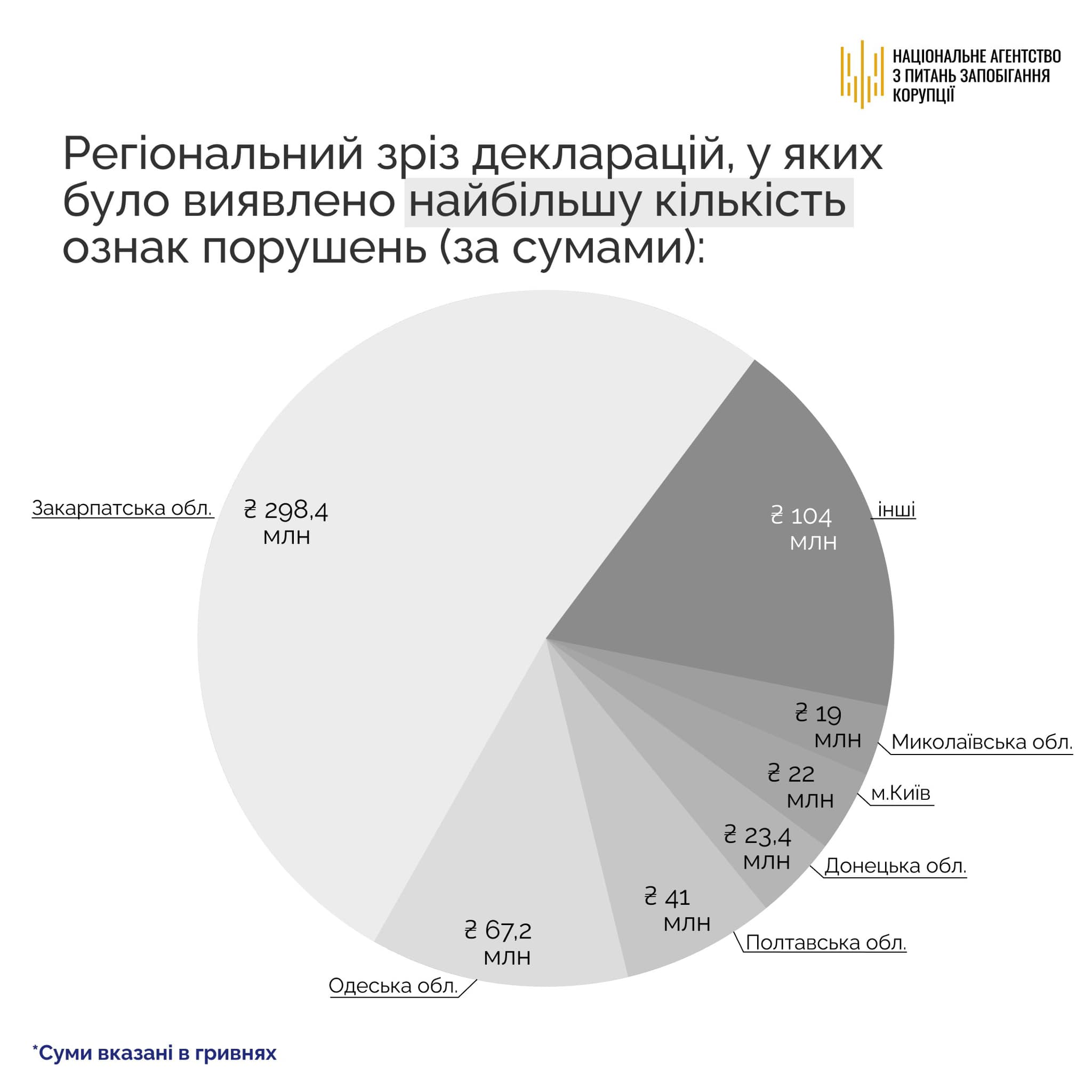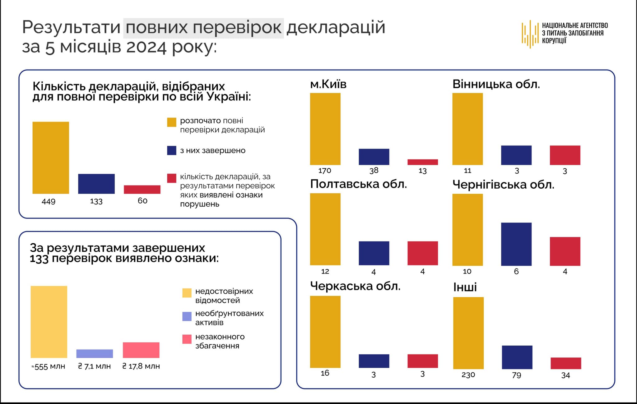 НАЗК знайшло у поданих за перші місяці року деклараціях 555 млн грн недостовірних відомостей, необґрунтованих активів на 7,1 млн грн і ознак незаконного збагачення на 17,8 млн грн. За результатами перевірок декларацій НАЗК, які проводяться враховуючи новий ризик-орієнтований підхід, виявлені невідповідності та потенційні порушення закону.
