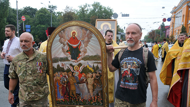 У хресному ході взяли участь військовослужбовці – учасники АТО. Деякі з учасників ходи тримали в руках державні прапори України та червоно-чорні прапори.