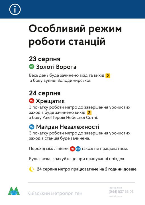 У разі необхідності 24 серпня перед початком урочистого концерту о 18:30, в залежності від пасажиропотоку, можливе закриття на вхід для пасажирів станції метро "Олімпійська".