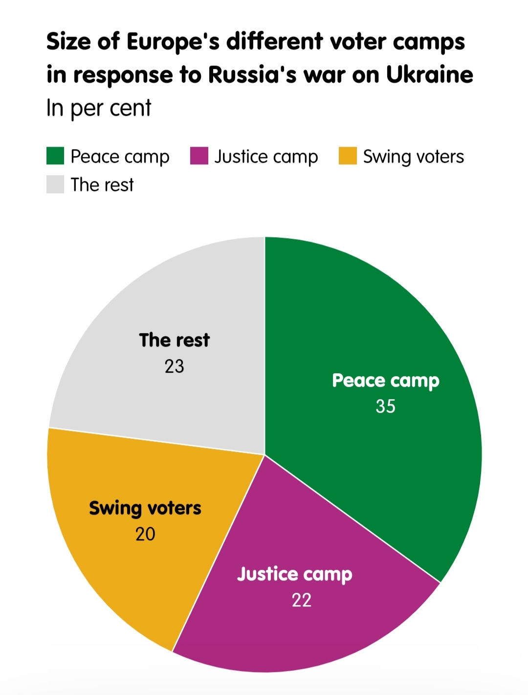 Результати опитування ECFR поділяють європейців на дві протилежні групи: табір «Миру» (35% людей), який хоче, щоб війна закінчилася якнайшвидше, навіть якщо це означає, що Україна йде на поступки та табір «Справедливості», який вважає, що лише явна поразка РФ може принести мир та метою є покарання Росії за її агресію та відновлення територіальної цілісності України (22%).