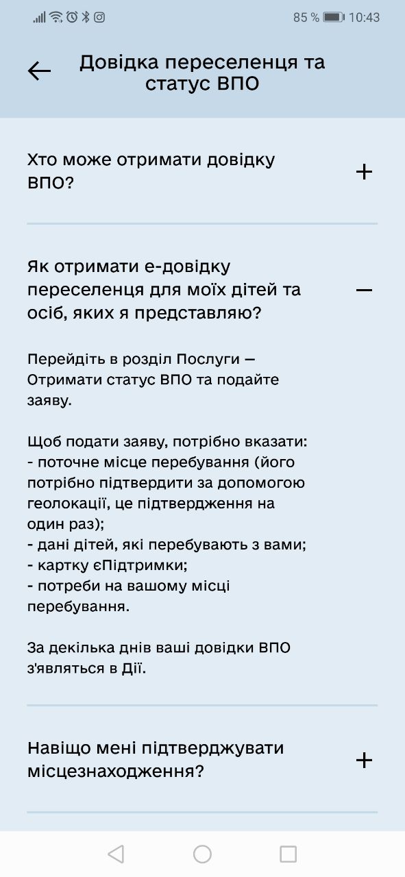 У «Дії» з'явилося роз'яснення, як отримати через додаток електронну довідку внутрішньо переміщеної особи для дітей та осіб, яких ви представляєте. Для цього, як пишуть, потрібно перейти в розділ «Послуги» – «Отримати статус ВПО» і подати заявку. Щоправда, самої опції в «Дії» досі немає.