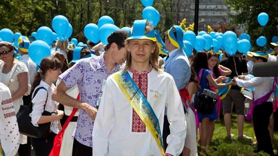 Випускники одинадцятих класів тримали в руках повітряні кулі синього і жовтого кольору, які складалися в Державний прапор України.