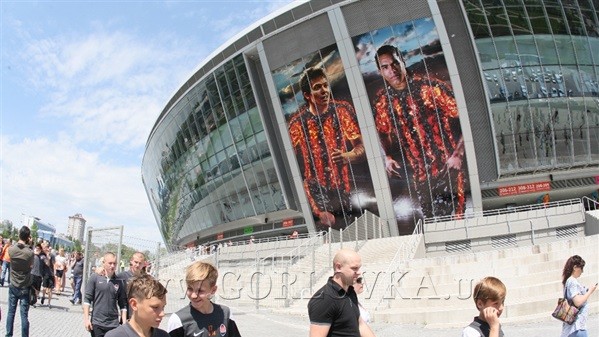 В акції також взяли участь юнаки з академії ФК "Шахтар". Вони одягнені у форму з логотипом футбольної команди. Гравці "Шахтаря" в акції не беруть участі, бо у них зараз відпустка: футболісти знаходяться у роз'їздах. При цьому на стадіон прийшли працівники ФК "Шахтар". Всього присутні понад 400 осіб.
