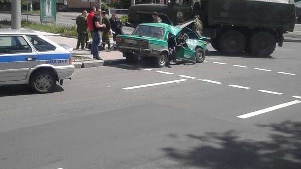 У неділю, 10 травня, у центрі Донецька, на перехресті вулиці Університетської і проспекту Панфілова, сталося ДТП за участю "Уралу" бойовиків "ДНР", повідомляє 62.ua.