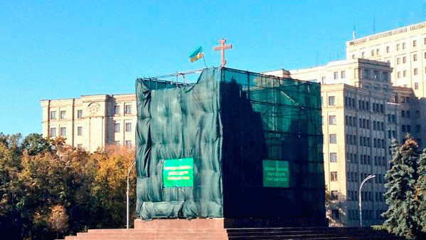 Замість знесеного пам'ятника Леніну на площі Свободи в Харкові на постаменті встановлено чотириметровий хрест. Важить споруда понад 100 кілограмів.
