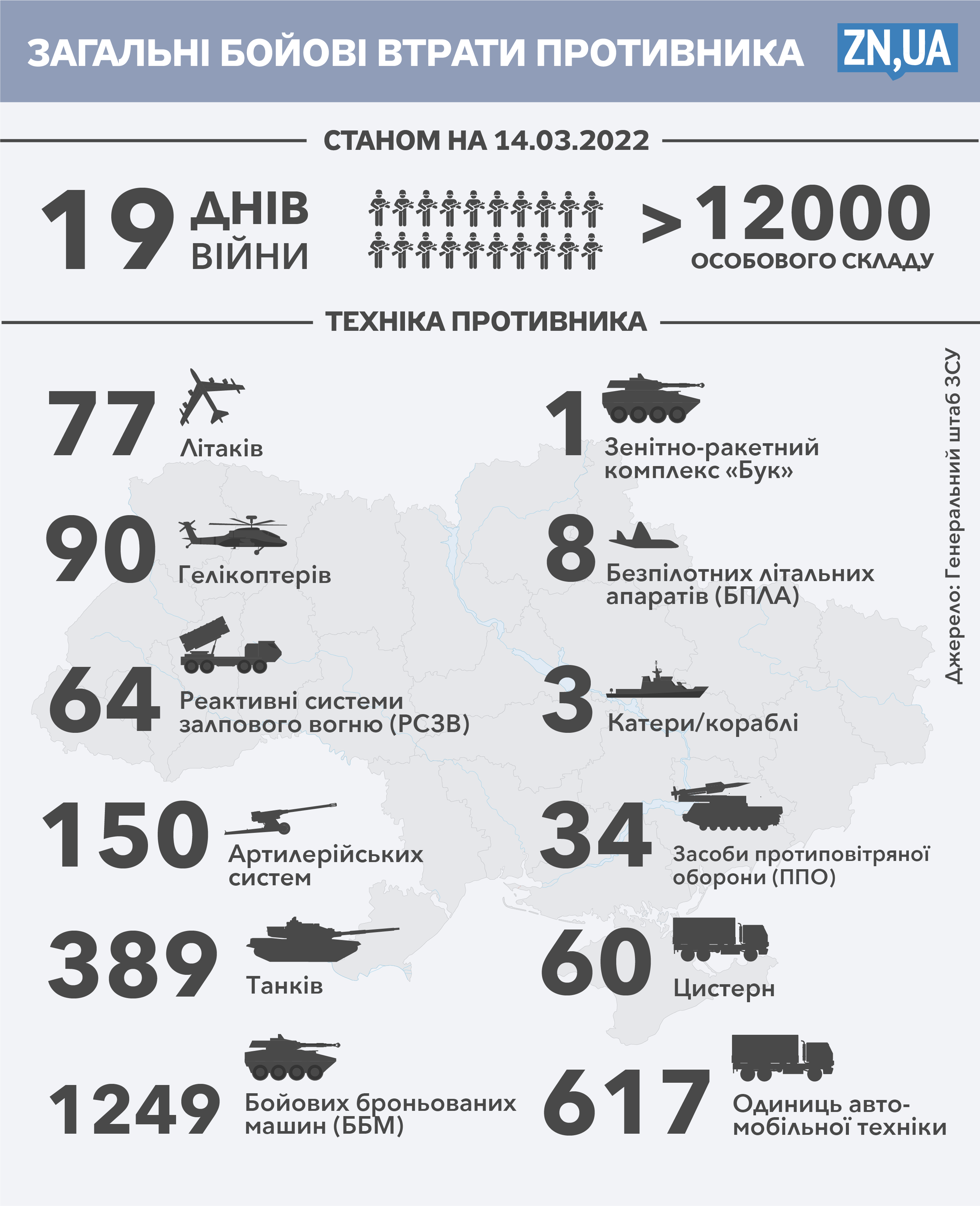 Загальні бойові втрати окупантів з 24.02 по 14.03 орієнтовно склали: