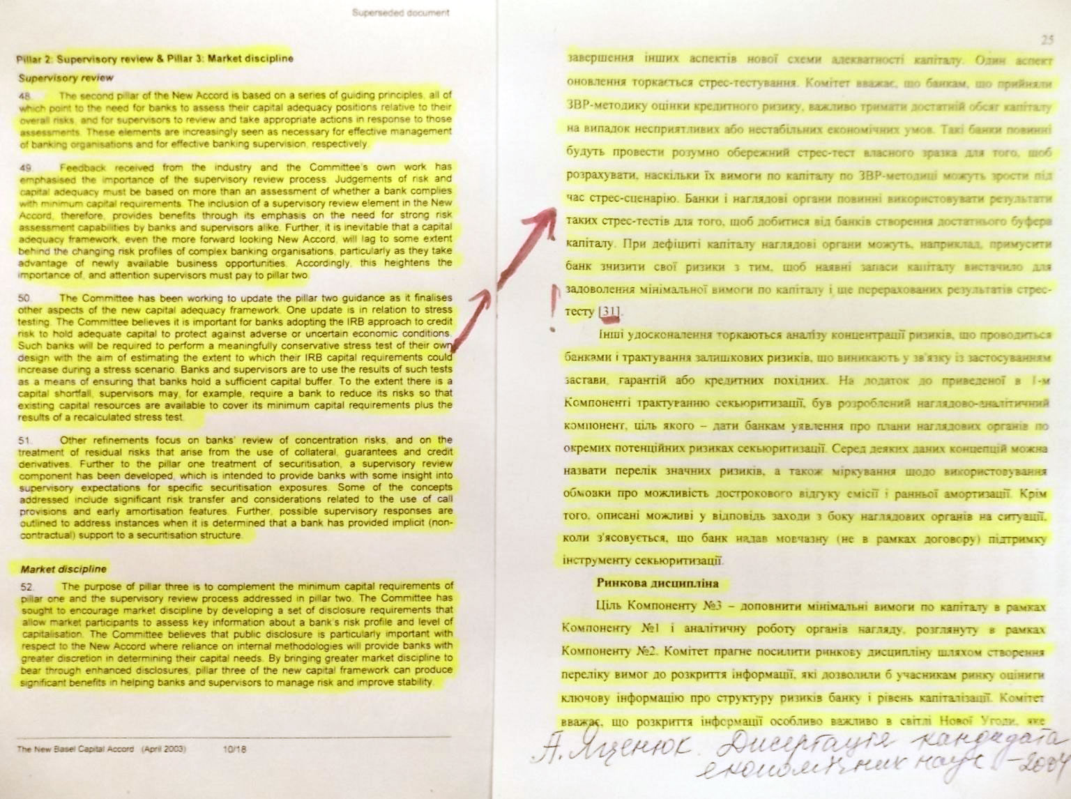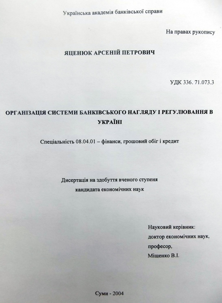 Автор зазначає, що кандидатську дисертацію "Організація системи банківського нагляду і регулювання в Україні" за спеціальністю 08.04.01 – фінанси, грошовий обіг і кредит" Арсеній Яценюк захистив 3 червня 2004 року в Українській академії банківської справи міста Суми.