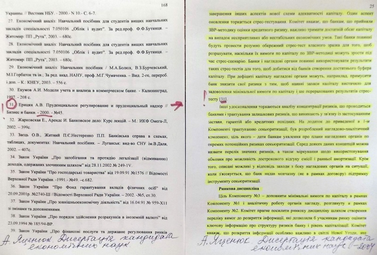 "Ознайомлення з повним текстом дисертації екс-прем'єра Яценюка дозволяє стверджувати: 70 сторінок (з яких 39 повністю або за виключенням одного-двох речень) її основної частини (с.4 -165) – містять тексти без посилань на їх справжніх авторів. І це – не рахуючи 7 сторінок буквального перекладу з англійського оригіналу, наведеного з порушенням правил цитування: відсутність лапок при буквальному відтворенні тексту, із поодинокими посиланнями, у т.ч. фейковими", – вказує вона.