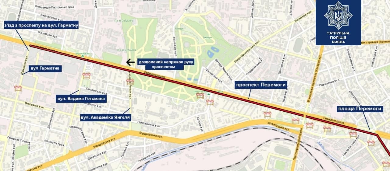 - виїздах на проспект з Повітрофлотського шляхопроводу, вулиці Вадима Гетьмана та інших.