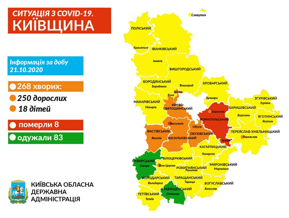 Всього за період епідемії в Київській області померли 303 хворих з підтвердженим COVID-19. За добу надійшли повідомлення про вісім летальних випадків - померли чотири жінки, з них дві 44 й 84 роки (м Вишгород), 44 роки (с. Забір'я Києво-Святошинського району), 80 років (с. Вороньків Бориспільського району), й четверо чоловіків, 65 років (м Бориспіль), 66 років (с. Пилипче Баришівського району), 67 років (с. Германівка Обухівського району), 79 років (с. Ксаверівка Васильківського району.
