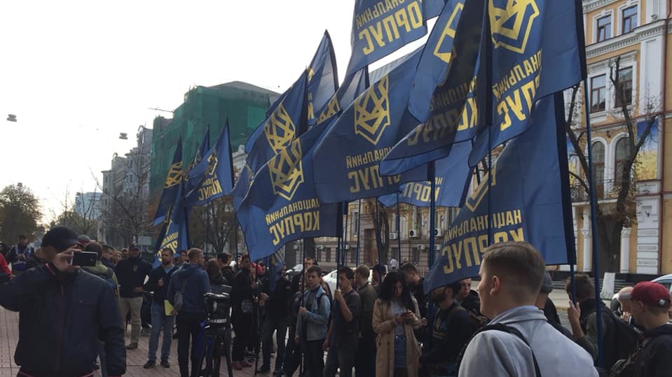 За даними агентства "Інтерфакс-Україна", на вулиці Володимирській, 33, зібрались близько 60 активістів із прапорами "Нацкорпусу".