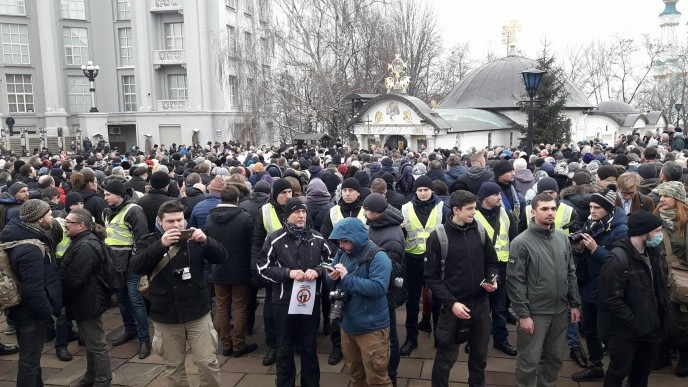 Також там знаходяться люди, які прийшли в храм на суботню літургію, і стоять поруч з каплицею з іконами в руках. Територію патрулюють поліцейські, а на прилеглих вулицях чергують шість автобусів з бійцями Національної гвардії.
