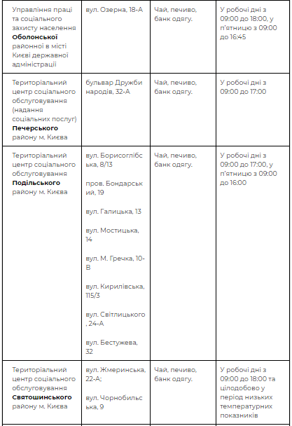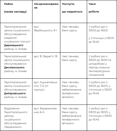 Однак, пунктів обігріву немає Київському міському територіальному центрі соціального обслуговування та у Територіальному центрі надання соцпослуг Голосіївського району.