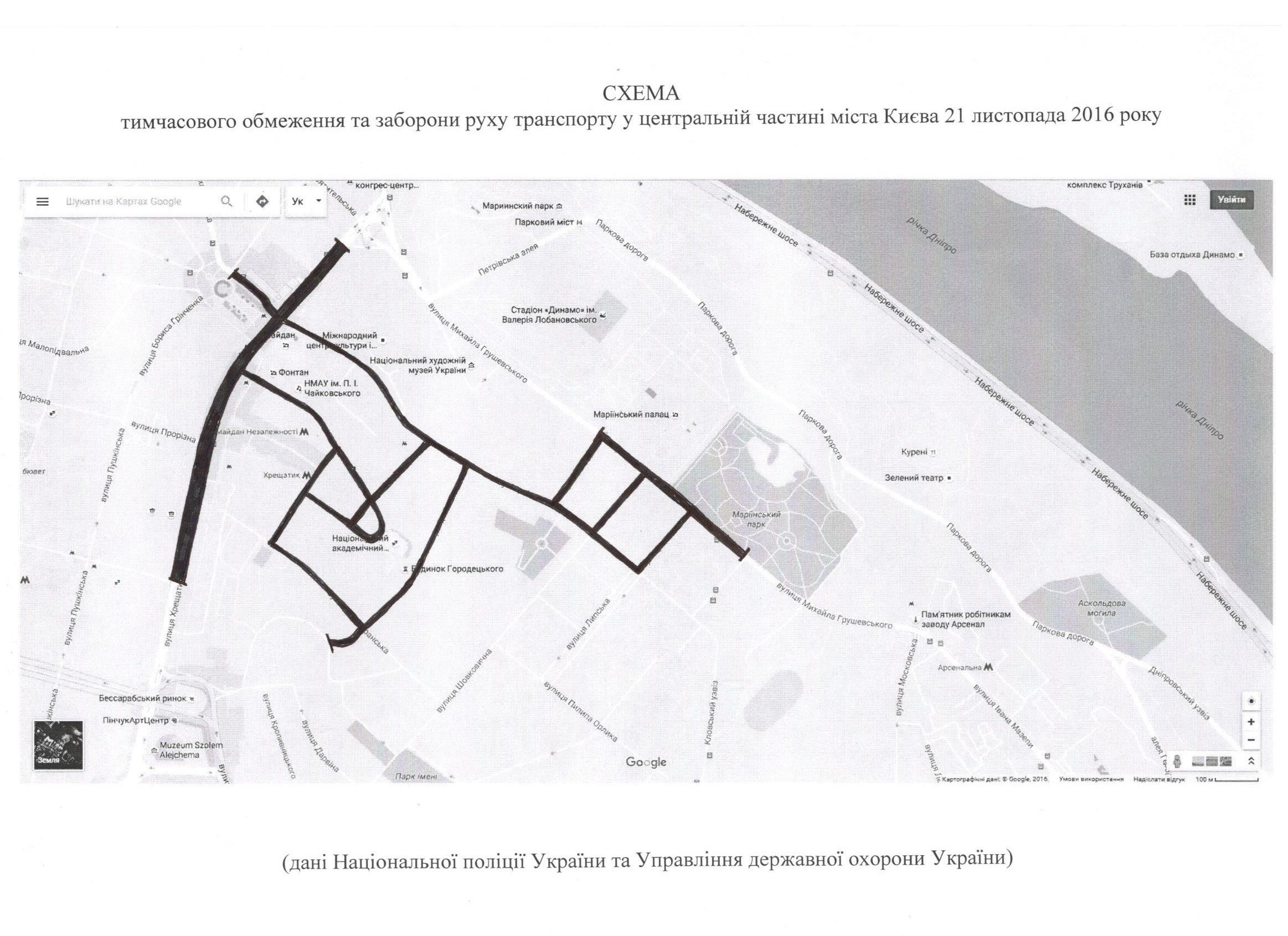 З 06:00 ранку до закінчення заходів буде перекрито рух транспорту на вул. Хрещатик (на відрізку від вул. Б. Хмельницького до будинку № 3 на вул. Хрещатик), вул. Михайлівській (на ділянці від вул. Хрещатик до перетину з вул. Костьольній), вул. Архітектора Городецького, вул. Ольгинської та вул. Інститутській (на відрізку від алеї Героїв Небесної сотні до будинку № 13/14 на вул. Інститутської).
