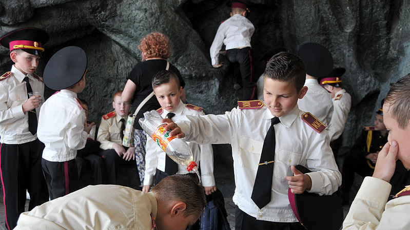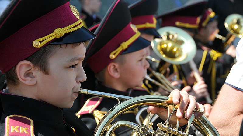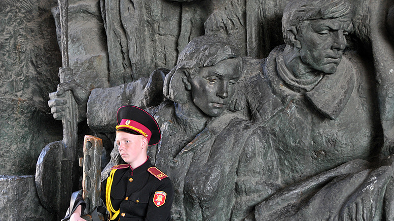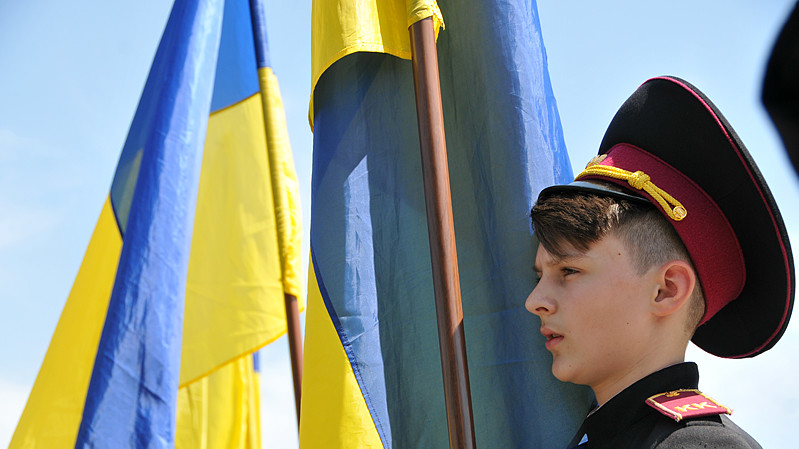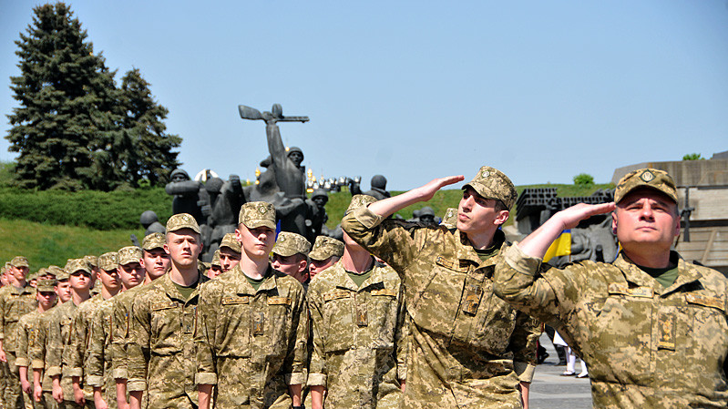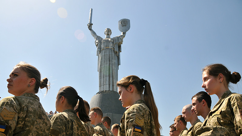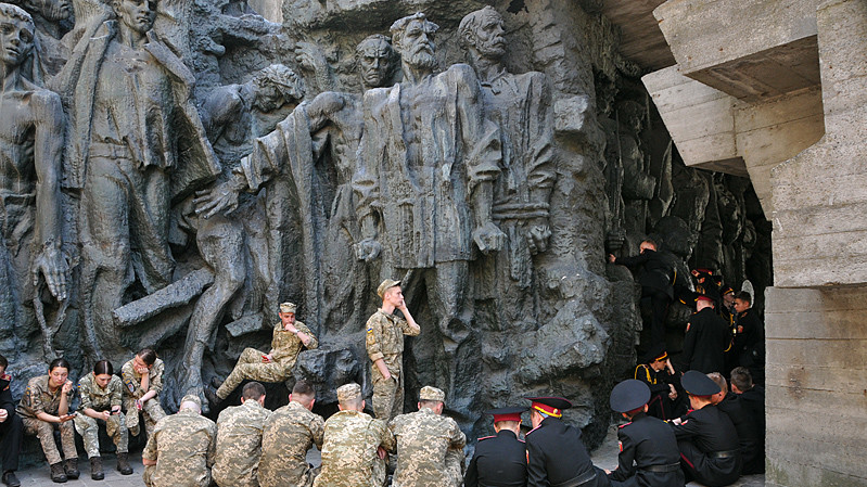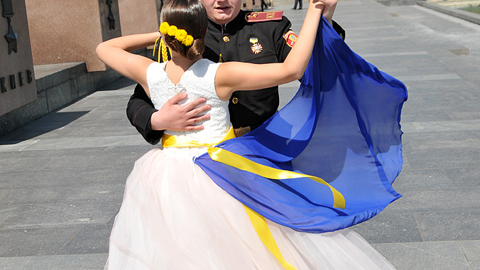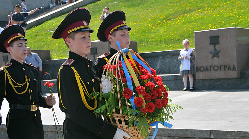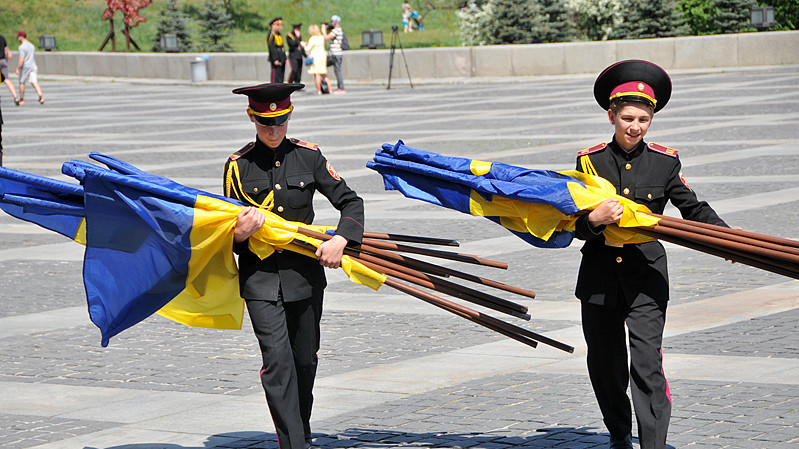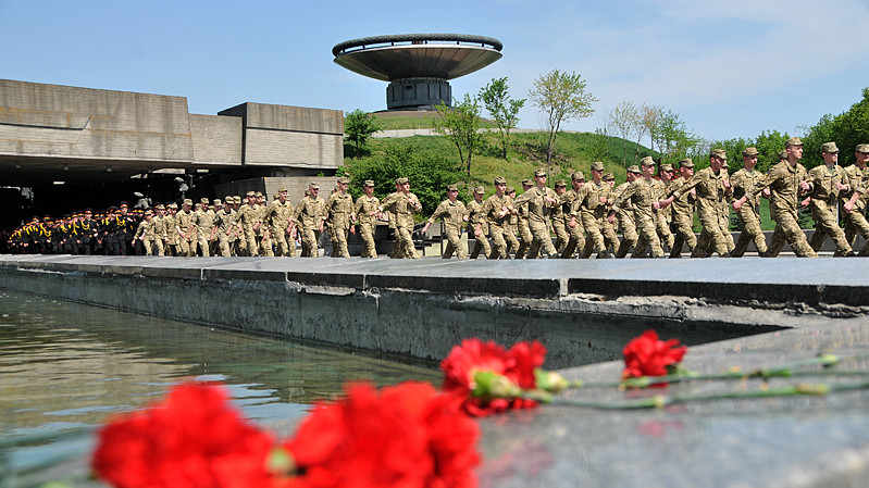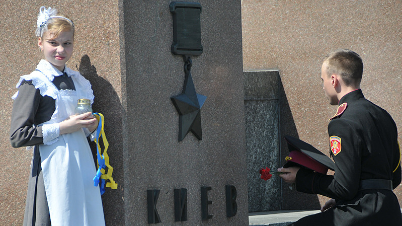 На площі перед музеєм історії України у Другій світовій війні 700 кадетів, школярів і студентів провели урочистий парад і сформували "Живий герб України". Флешмоб був присвячений 73-й річниці перемоги над нацизмом. Крім того, відбувся урочистий парад, а також школярі ліцею-інтернату № 23 "Кадетський корпус", курсанти Військового ліцею ім. Івана Богуна та Інституту спеціального зв'язку та захисту інформації Київського політехнічного інституту ім. І. Сікорського, військового інституту Національного університету України ім.Т.Шевченкалюди винесли на схили Дніпра 73 українських прапора.