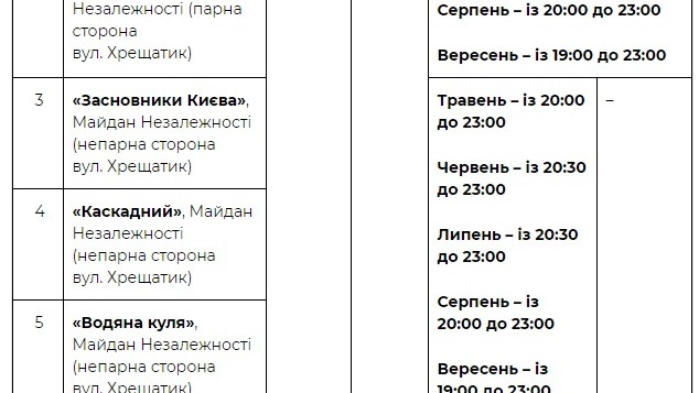 Як і в попередні роки, фонтанні комплекси Великий і Малий на Майдані Незалежності, а також комплекс фонтанів в акваторії Русанівського каналу будуть працювати в режимі світло-музичного шоу.