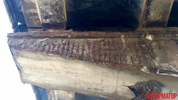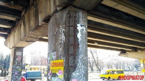 Шляхопровід над станцією метро "Нивки" в Києві перебуває в аварійному стані, повідомляє кореспондент видання "ІНФОРМАТОР". Центральні опори над проїжджою частиною транспортної розв'язки облуплені, покриті тріщинами, у багатьох місцях видно іржаву арматуру. По конструкціях з мосту стікає дощова і тала вода, затікає в тріщини і поступово робить свою руйнівну роботу.