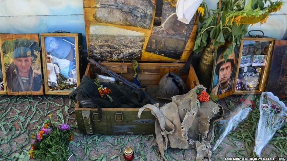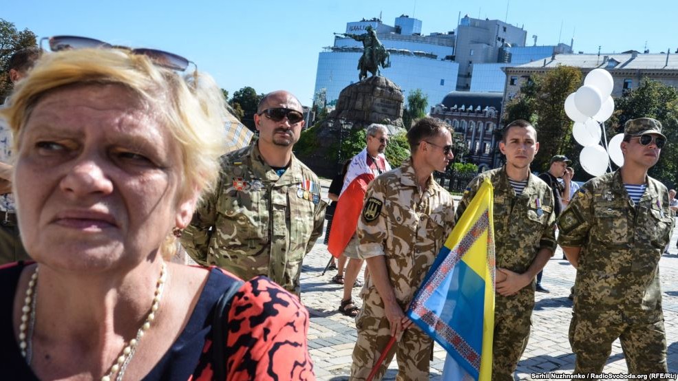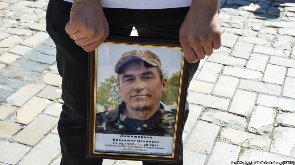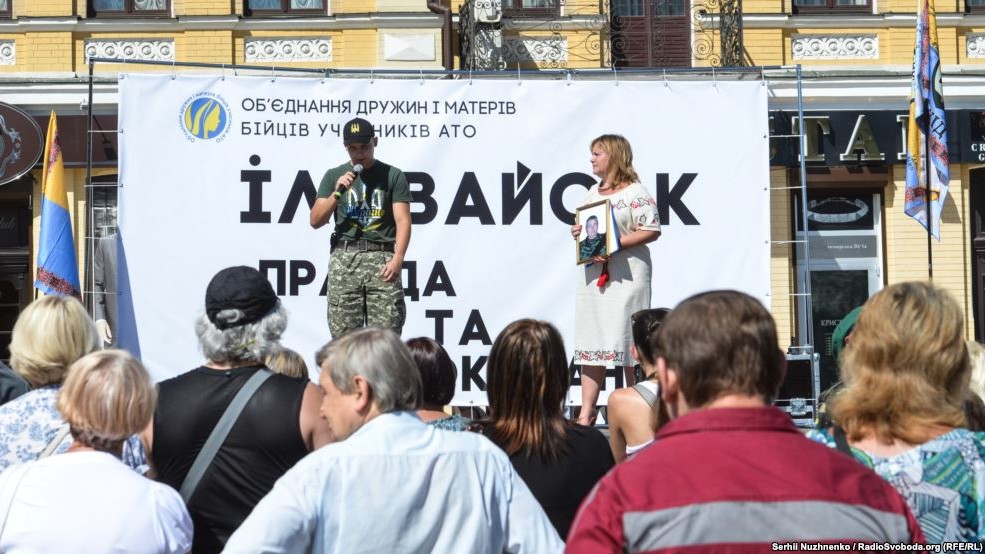 На Софійській площі в Києві 28 серпня близько сотні людей прийшли вшанувати пам'ять загиблих під Іловайськом бійців. Серед учасників акції - рідні та близькі загиблих. В кінці траурного мітингу священик відслужив панахиду за бійцям.