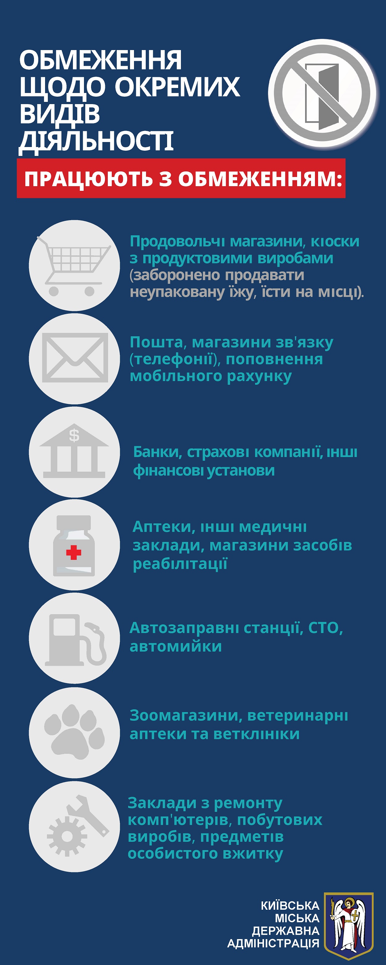 Крім того, розпорядженням встановлено особливий порядок проведення профілактичних і протиепідемічних заходів для навчальних закладів та гуртожитків навчальних закладів, для транспортних підприємств, для підприємств торгівлі господарськими товарами (засобами гігієни) - незалежно від їх підпорядкування і форми власності. А також для працівників підприємств з обслуговування житлового фонду, підприємств, установ і організацій, для яких неможливо перейти на дистанційний режим роботи, для тимчасових споруд (малих архітектурних форм), в яких здійснюється торгівля продовольчими та/або непродовольчими без приготування та/або споживання їжі та напоїв.