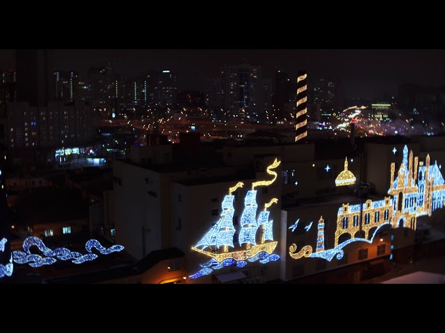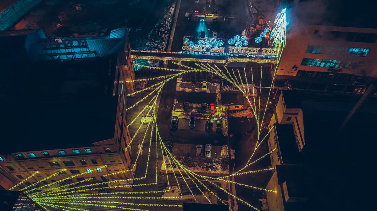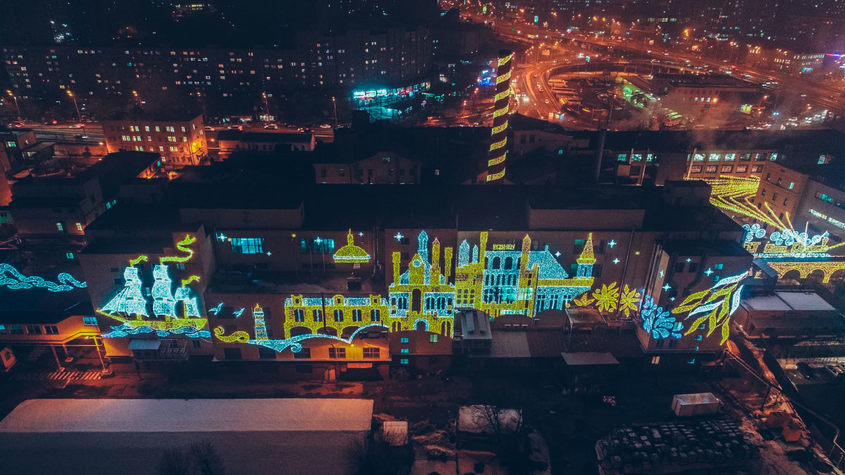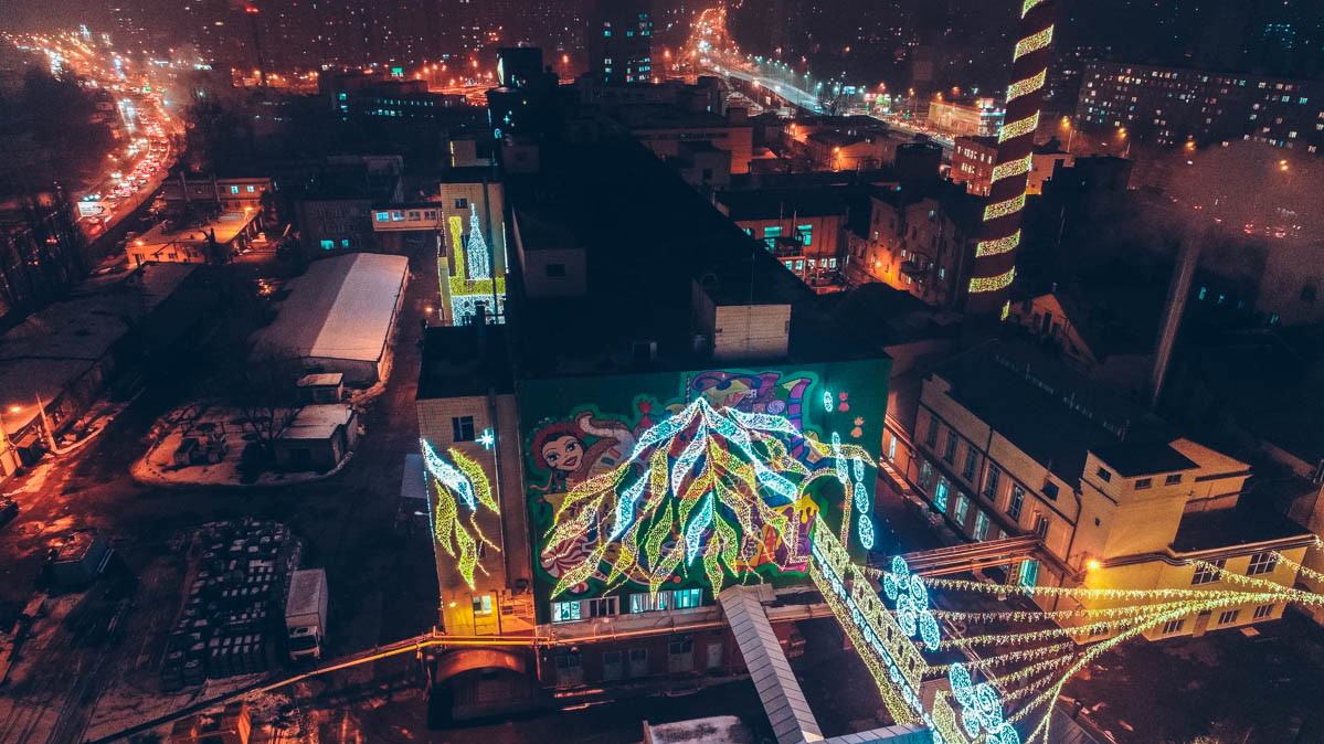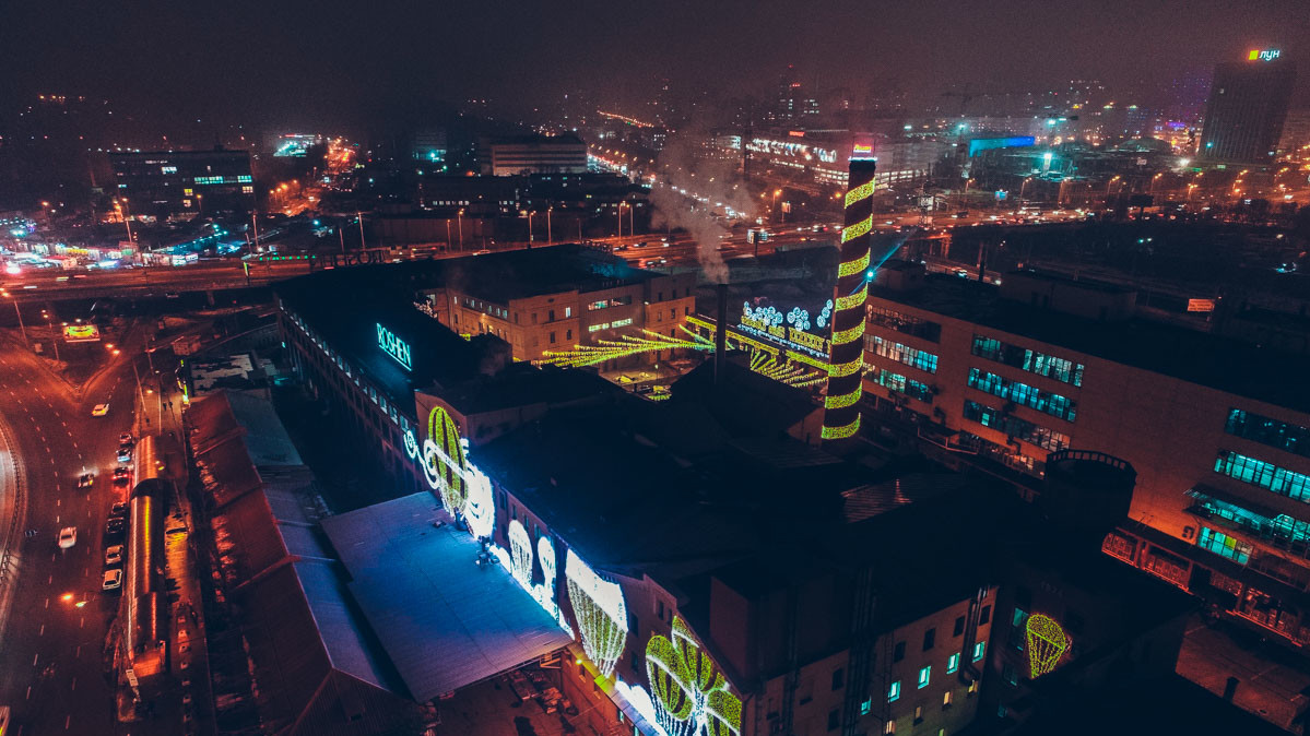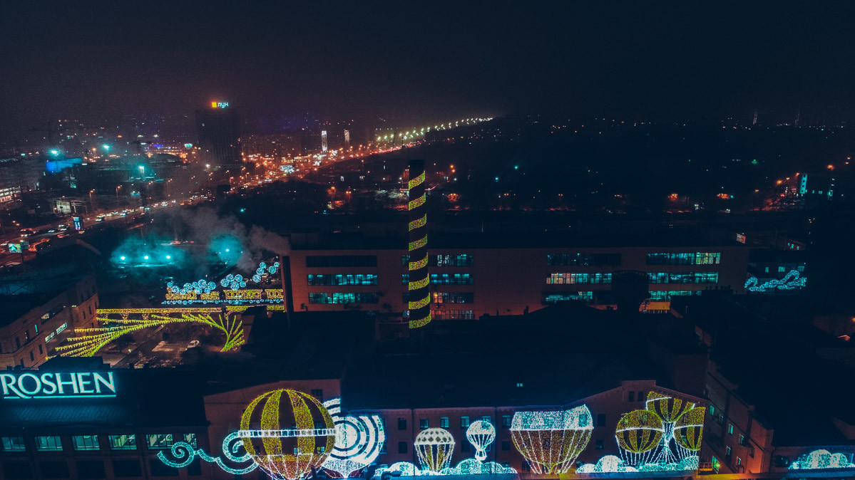 Напередодні Нового року будівлі кондитерської фабрики Roshen на проспекті Науки в Києві традиційно прикрасили яскравою ілюмінацією. Сірі цехи перетворилися на полотно з казковими картинами, які нагадують, що Новий рік вже не за горами. Найкраще ілюмінація виглядає з висоти в темний час доби.