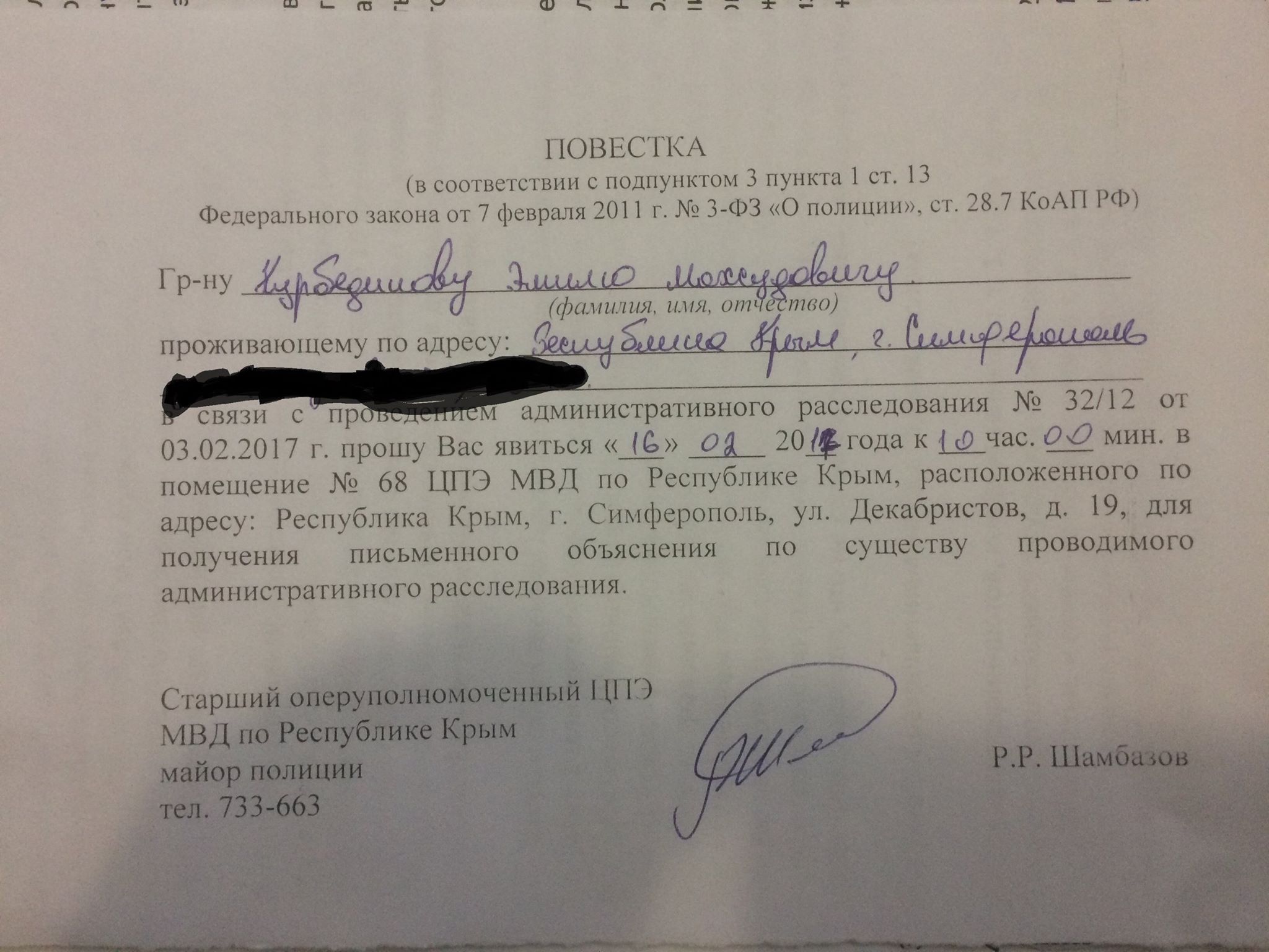 "Сьогодні принесли співробітники центру з протидії екстремізму ось таку повістку - мені і Едему Семедляєву", - написав на своїй сторінці у Facebook правозахисник.