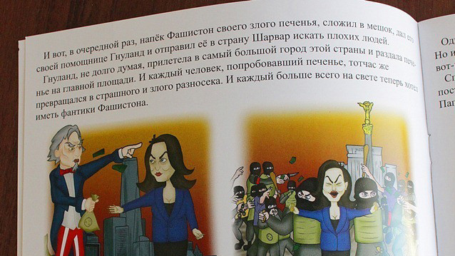 Одне з місцевих ЗМІ опублікувало фотографії сторінок журналу. На обкладинці красується Путін в образі папи, блондинка в сукні кольору російського прапора, а також діти у костюмах "ополченця", солдата російської армії, російського журналіста і радянської школярки.