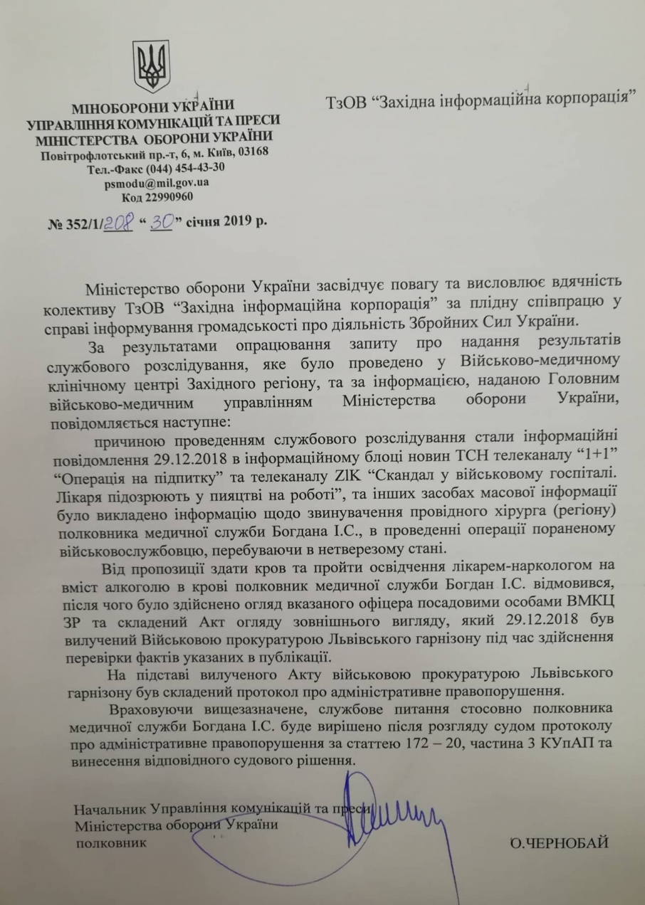 "Від пропозиції здати кров та пройти освідчення лікарем-наркологом на вміст алкоголю в крові полковник медичної служби Богдан І.С. відмовився, після чого було здійснено огляд вказаного офіцера посадовими особами ВМКЦ ЗР та складений Акт огляду зовнішнього вигляду, який 29.12.2018 був вилучений Військовою прокуратурою Львівського гарнізону під час здійснення перевірки фактів указаних в публікації. На підставі вилученого Акту військовою прокуратурою Львівського гарнізону був складений протокол про адміністративне правопорушення", – зазначило у відповіді на запит Міноборони.