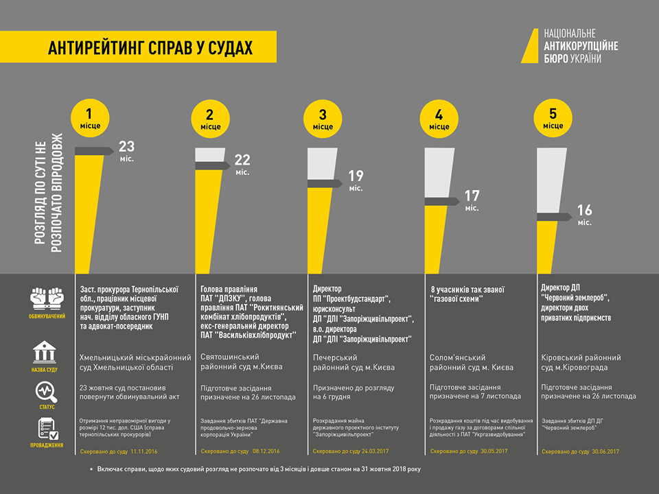 Як повідомила прес-служба НАБУ, "антирейтинг" очолює так звана справа "тернопільських прокурорів". Суд вкотре постановив повернути обвинувальний акт. Провадження не розглядається вже майже 2 роки після передачі до суду – з 11 листопада 2016 року.