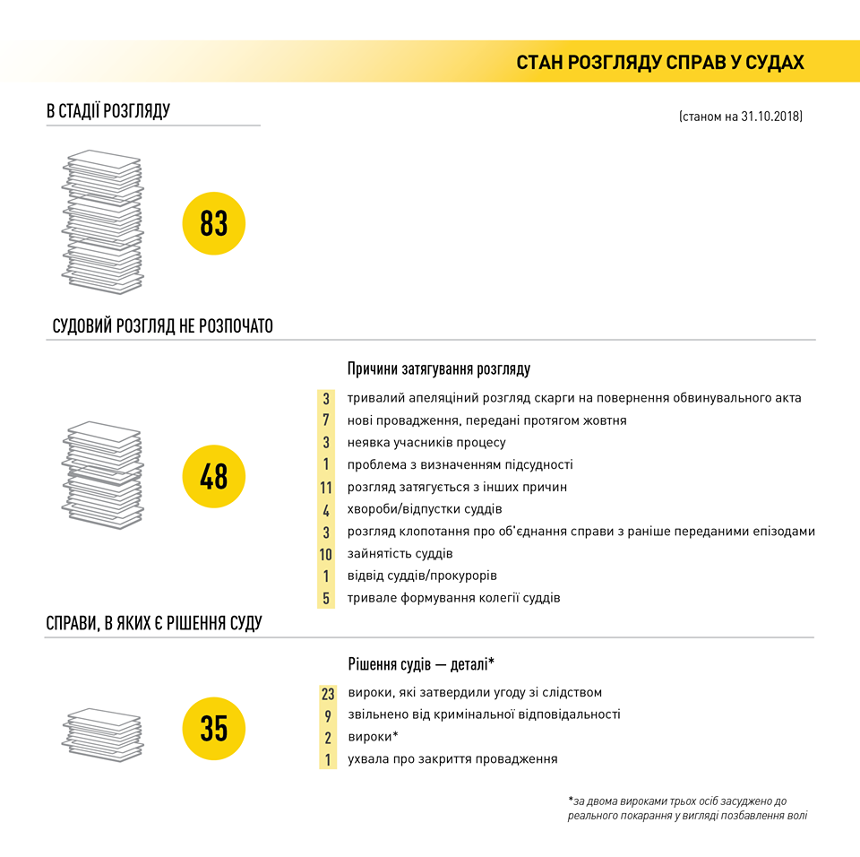З поміж 166 кримінальних проваджень Національного антикорупційного бюро, щодо яких станом на кінець жовтня 2018 року було завершено досудове розслідування та передано акти до суду, у 48 справах навіть не відбулося підготовче засідання.