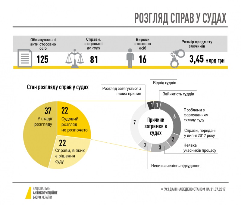 "Зважаючи на досить повільний розгляд справ, Бюро продовжує наголошувати на необхідності якнайшвидшого створення в Україні Спеціалізованого антикорупційного суду, який поставить "крапку" у справах від НАБУ та САП", - резюмували в Бюро.