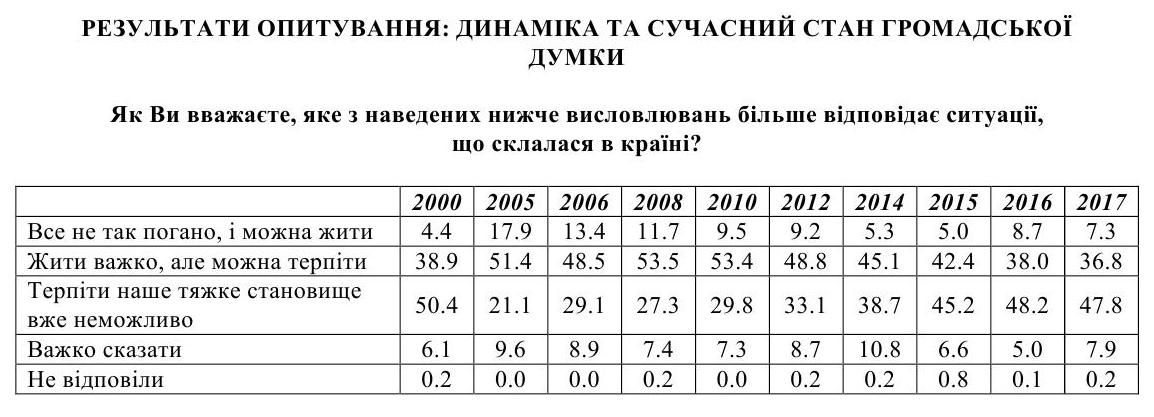 Водночас загальна оцінка населенням ситуації в країні за останні три роки не зазнала суттєвих змін. У 2017 році майже половина опитаних (48%) зазначає, що "терпіти наше тяжке становище вже неможливо" (у 2016 р. – 48%, 2015 р. – 45%, 2014 р. – 39%).