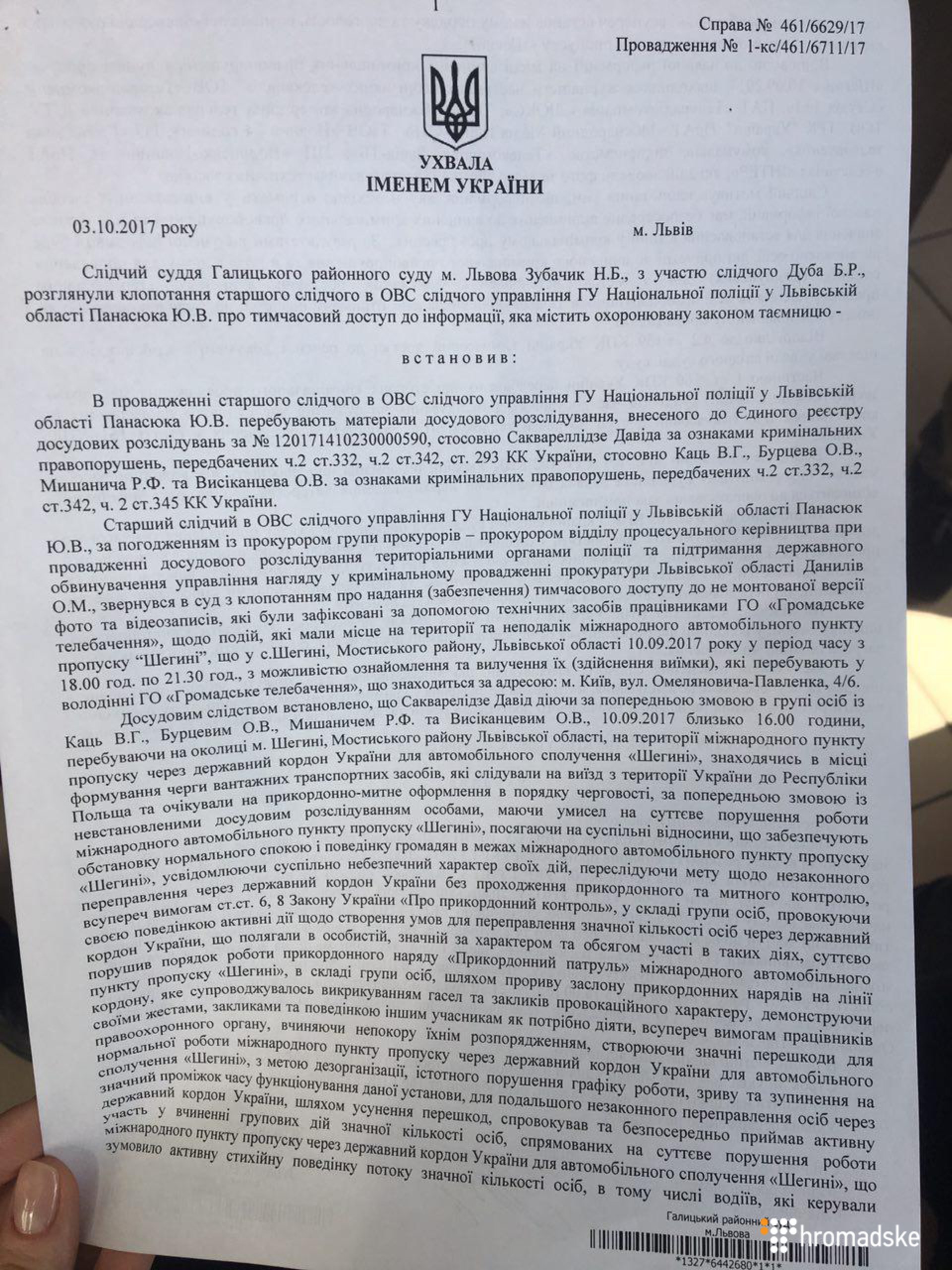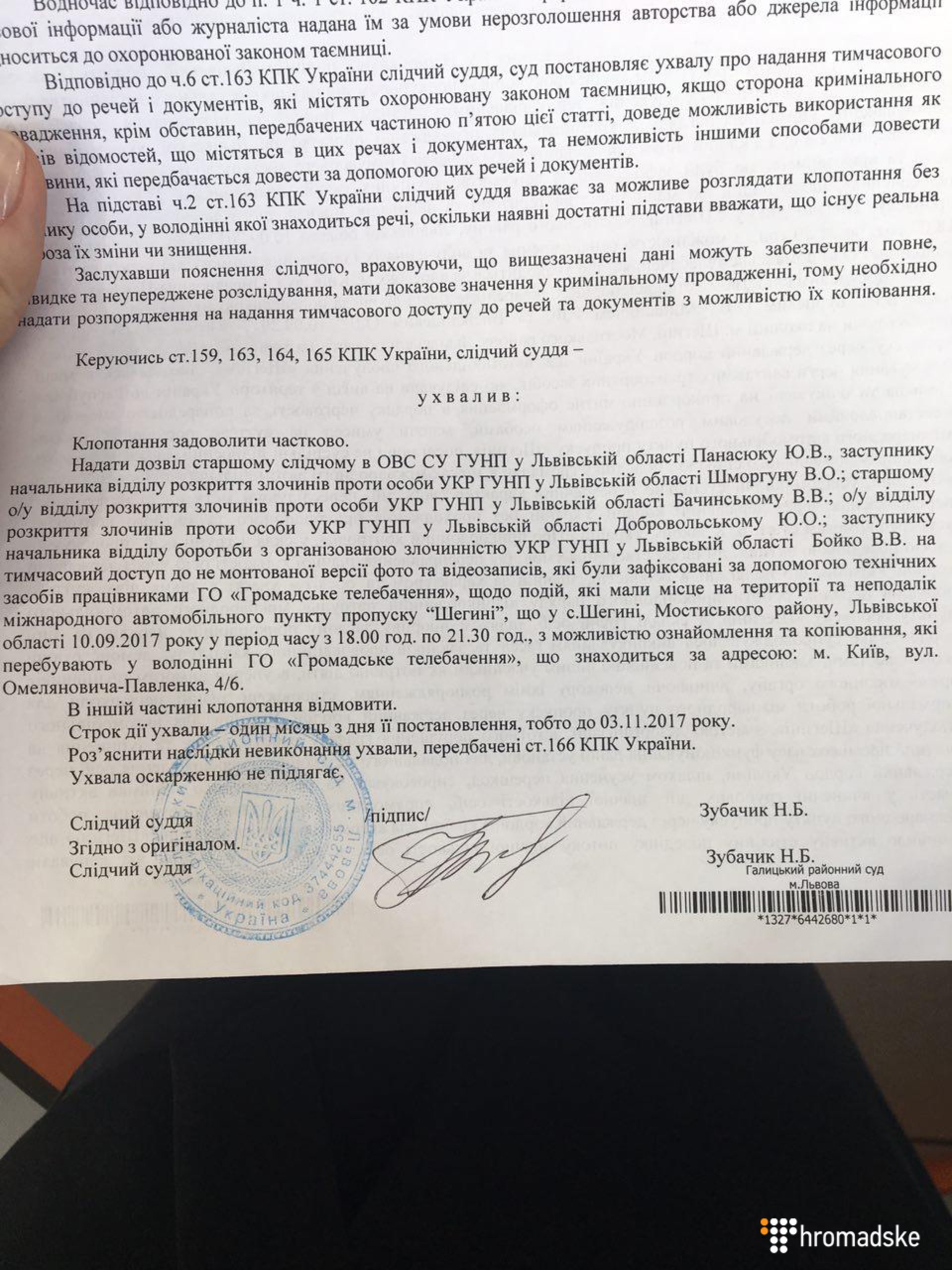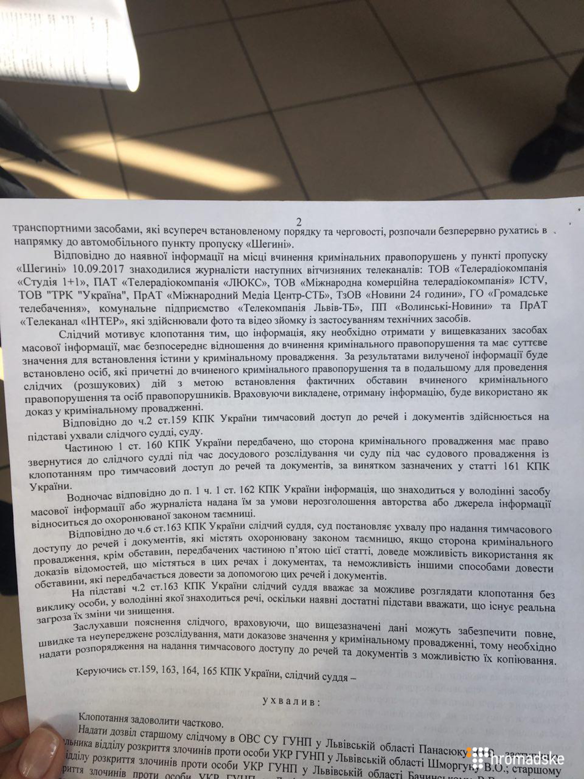 В ухвалі Галицького районного суду Львова йдеться про те, що слідчий львівської Нацполіції за погодженням із прокуратурою "звернувся до суду з клопотанням про надання тимчасового доступу до не монтованої версії фото та відеозаписів, які були зафіксовані за допомогою технічних засобів працівниками ГО "Громадське телебачення" щодо подій, які мали місце неподалік міжнародного автомобільного пункту пропуску "Шегині"… 10.09.2017 року з можливістю ознайомлення та вилучення їх".