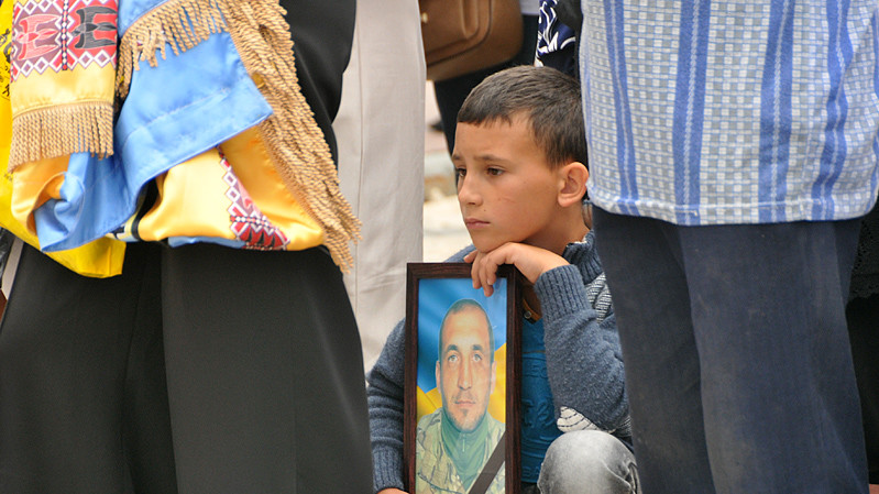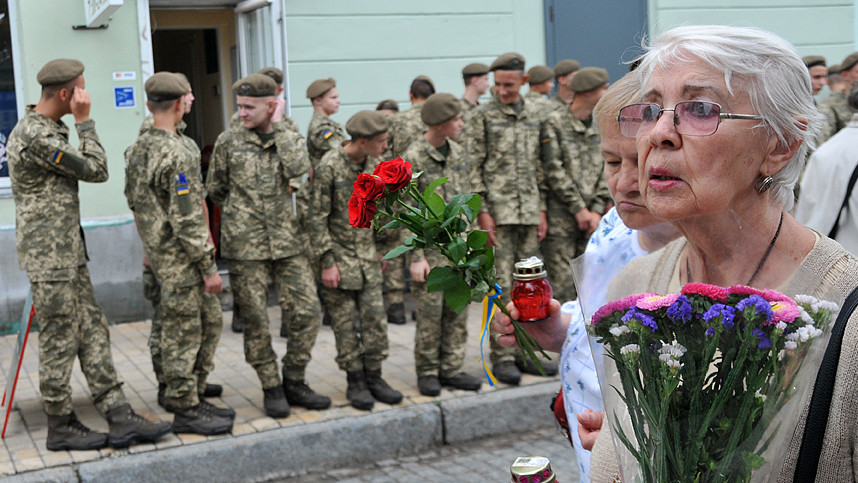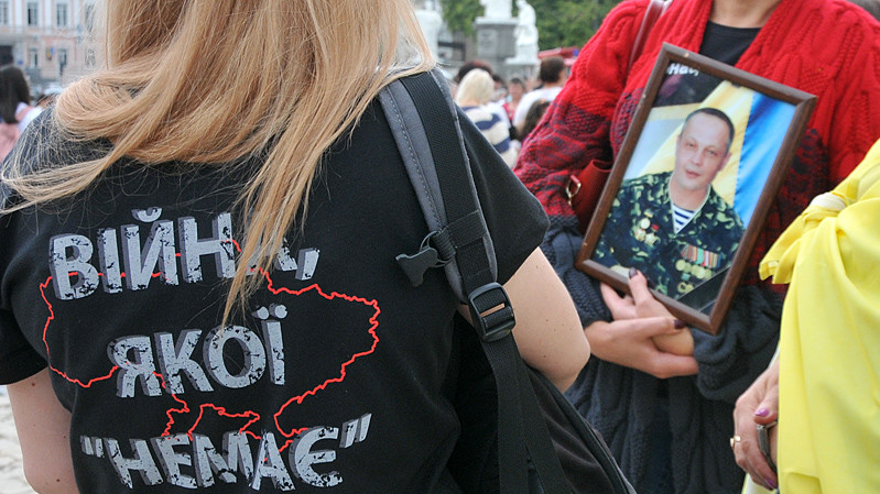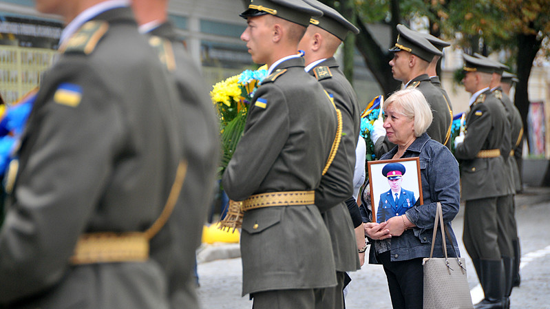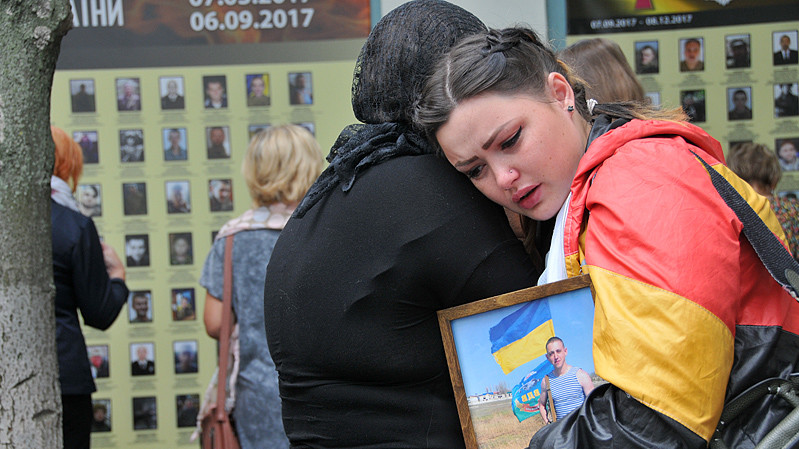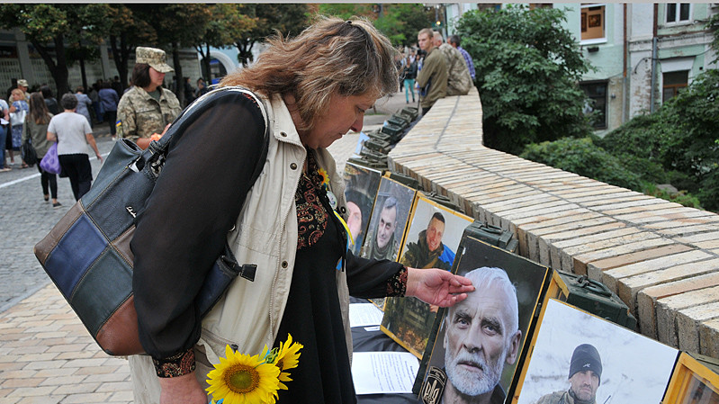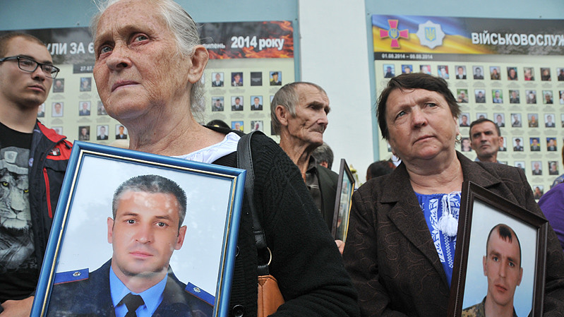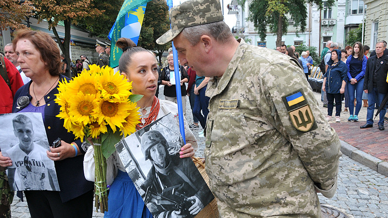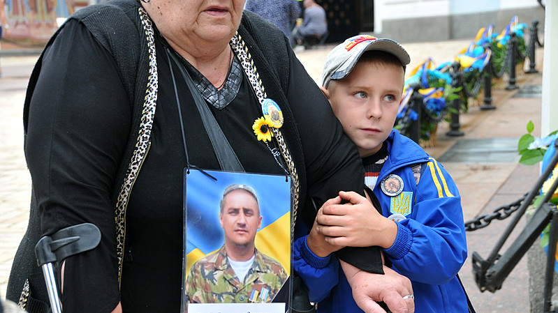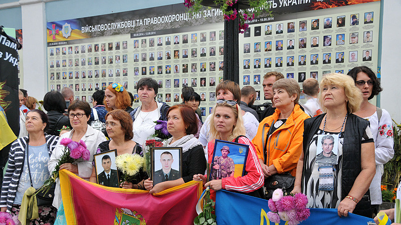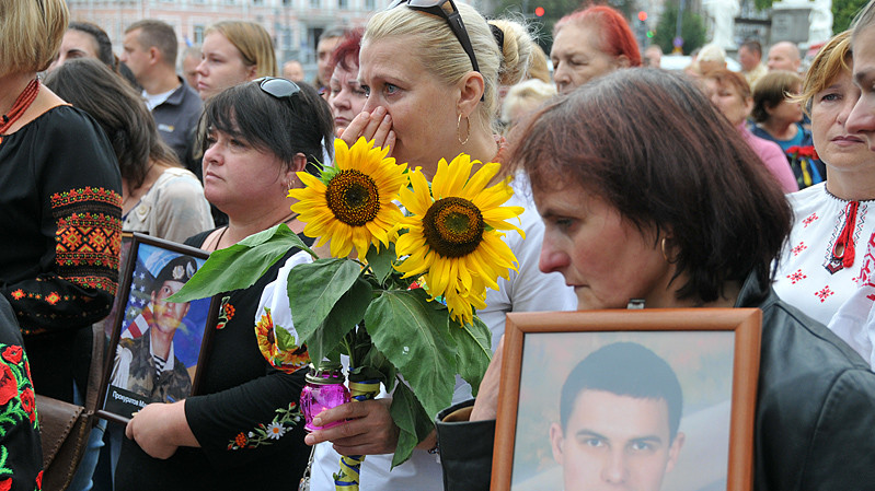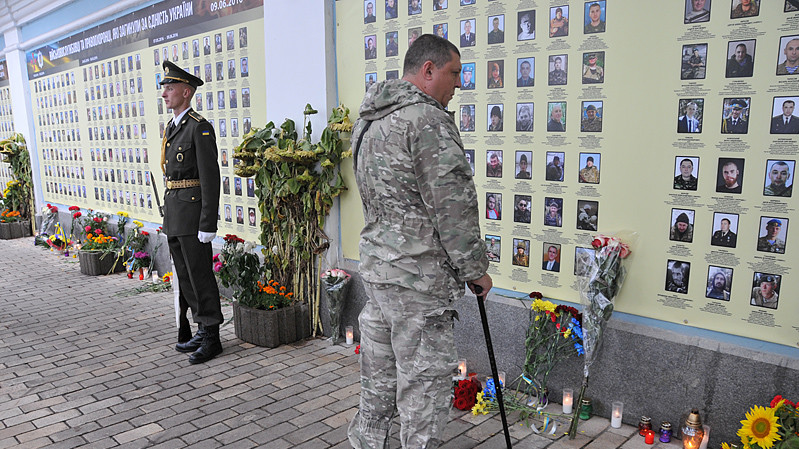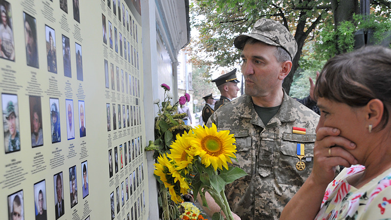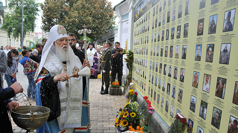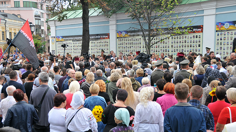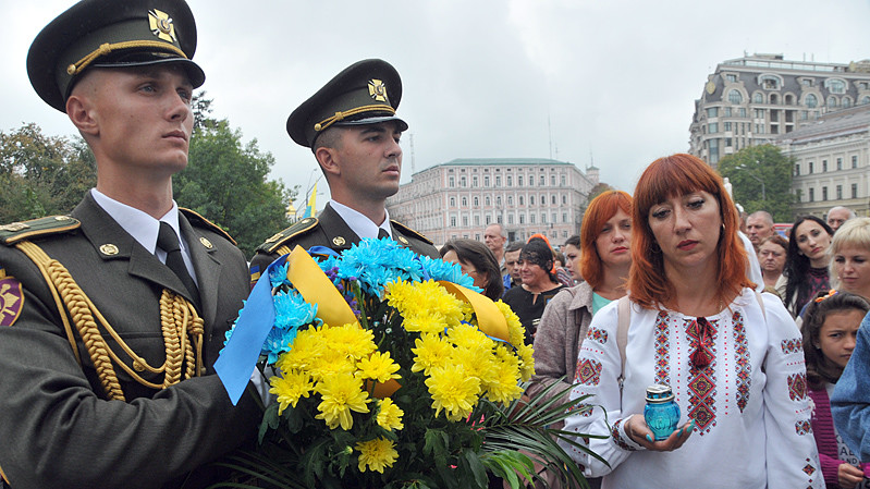 У Києві на Михайлівській площі в річницю Іловайської трагедії хвилиною мовчання вшанували українських військових і добровольців, які загинули в боях на Сході України. На площі зібралися кілька сотень людей: рідні загиблих, їх товариші по службі, друзі, представники громадських організацій. До стіни пам'яті прийшли також учасники боїв за Іловайськ, яким вдалося вижити. Патріарх УПЦ (КП) Філарет провів молебень у пам'ять про загиблих на Донбасі. Жінки одягли чорні хустки, на обличчях багатьох з них можна було побачити сльози. Багато людей прийшли з квітами соняшника – неофіційними, але впізнаваним символом боїв 2014 року на Донбасі.