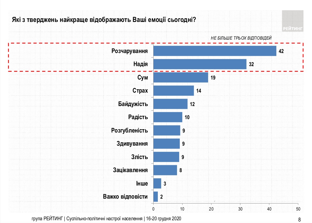 Якщо говорити про емоції, які переважають в українців сьогодні, то 42% громадян відчувають розчарування. Про відчуття надії розповіли 32% опитаних.