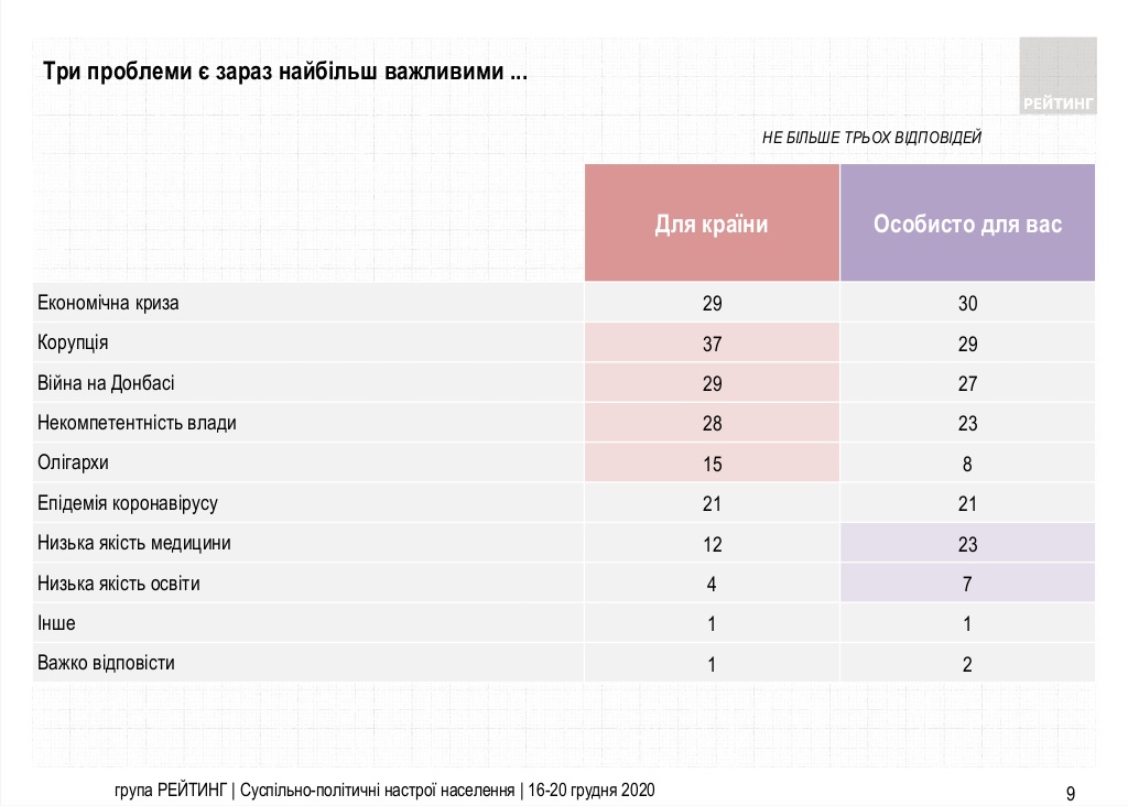 Головними загальнонаціональними проблемами українці вважають корупцію, війну в Донбасі, економічну кризу, некомпетентність влади та епідемію коронавірусу. При цьому, як зазначили соціологи, на особистісному рівні до перелічених проблем додалася ще й низька якість медицини, а проблема економічної кризи все ж очолює “рейтинг проблем”.