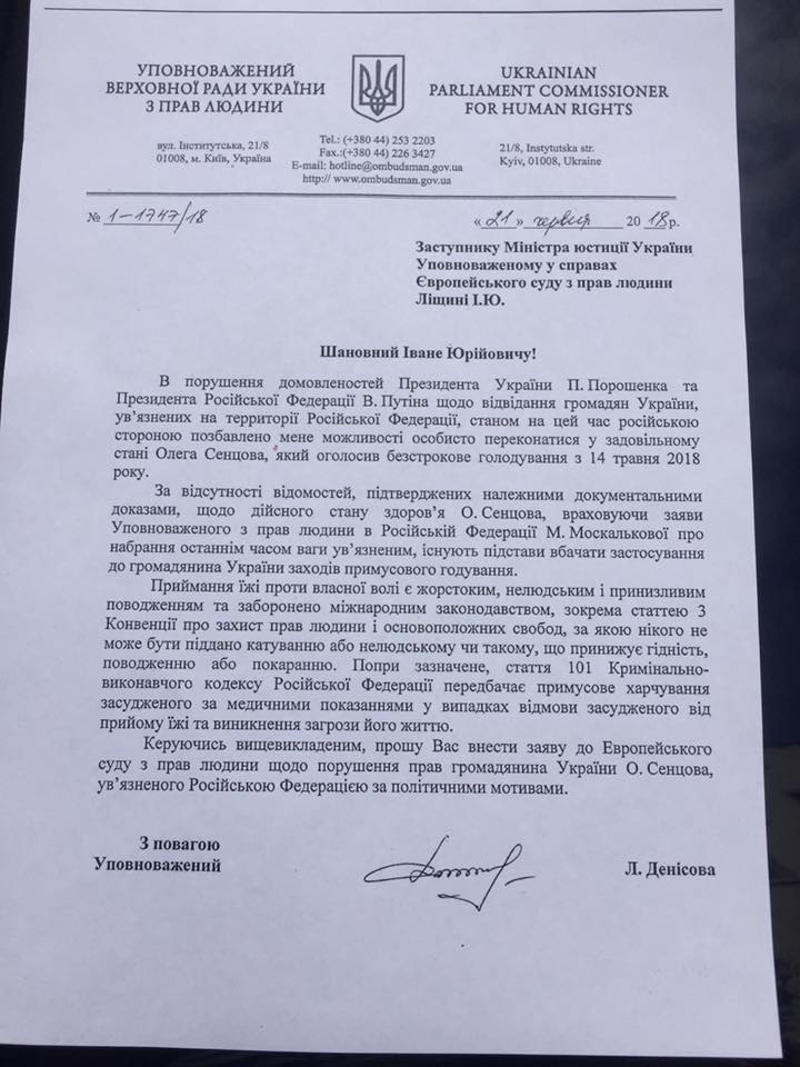 "Приймання їжі проти власної волі є жорстоким, нелюдським та принизливим поводженням та заборонено міжнародним законодавством. Тому я звернулася до заступника Міністра юстиції України Івана Ліщини з проханням внести заяву до Європейського суду з прав людини щодо порушення прав громадянина України Олега Сенцова, ув'язненого Російською Федерацією за політичними мотивами", - додає Денісова.