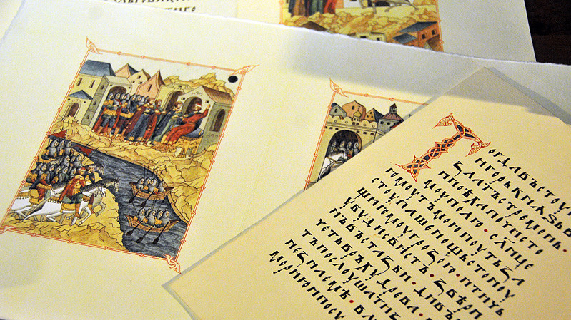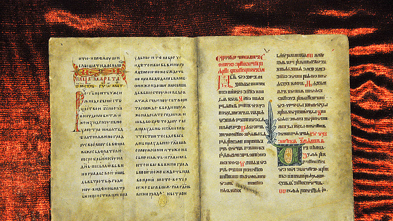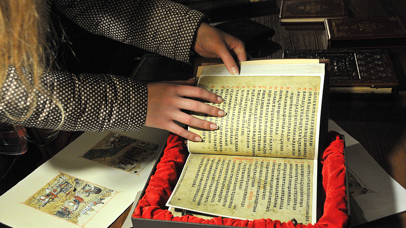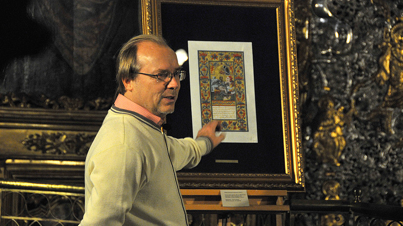 У Софійському соборі пройшла виставка-презентація автентичних копій стародавніх рукописів перших пам'яток української писемності, створених у рукописній майстерні Юрія Храпая.