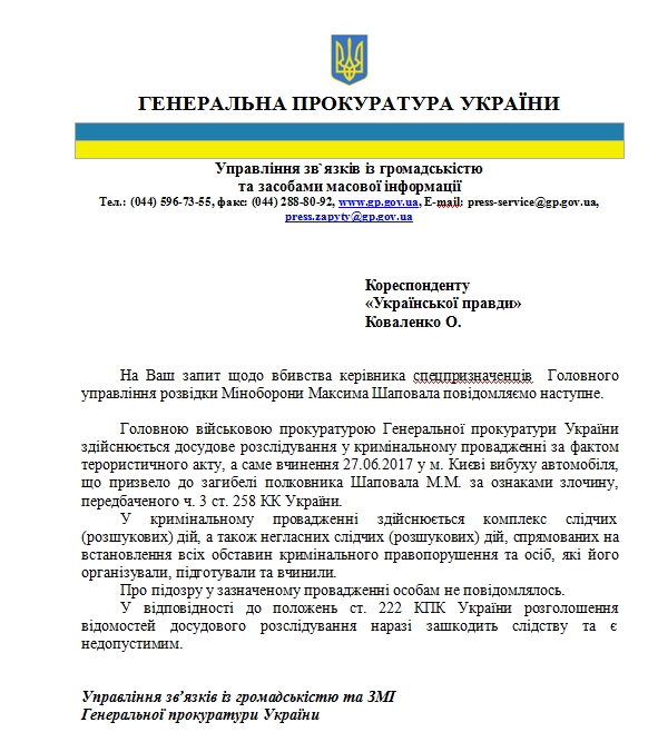"Головною військовою прокуратурою Генеральної прокуратури України здійснюється досудове розслідування у кримінальному провадженні за фактом терористичного акту, а саме вчинення 27.06.2017 в м. Києві вибуху автомобіля, що призвело до загибелі Шаповала М. М. за ознаками злочину, передбаченого ч. 3 ст. 258 КК України", – йдеться в документі.