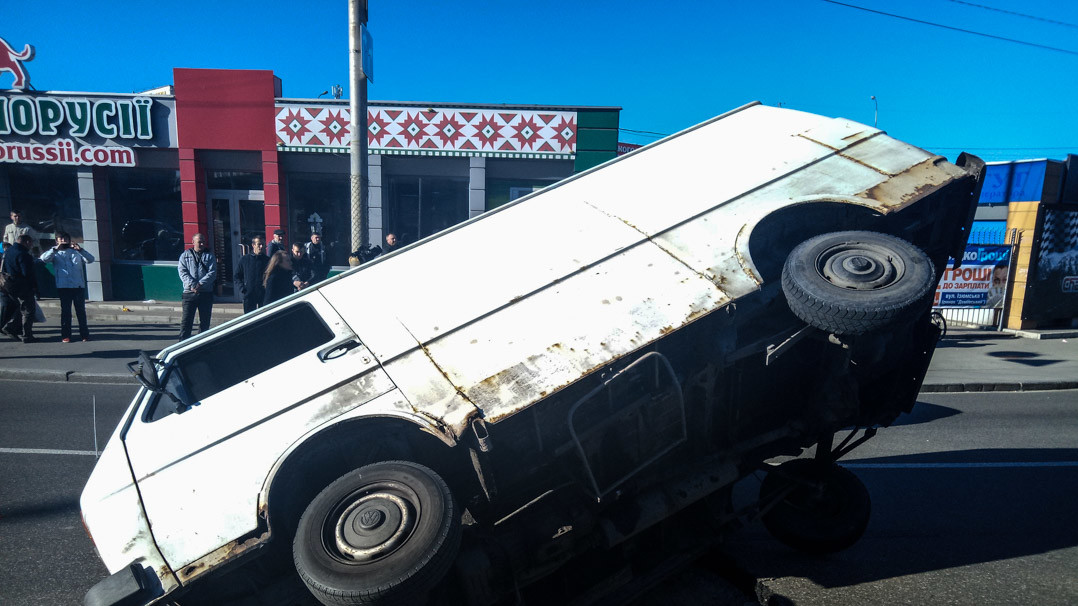 У Києві на Деміївській площі мікроавтобус Volkswagen на ходу провалився під землю. Автобус рухався по площі в бік проспекту Лобановського і провалився в яму на дорозі. Водій, на щастя, не постраждав.