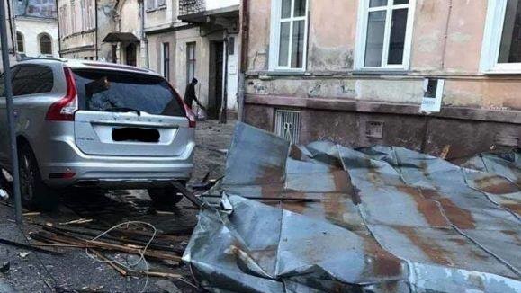 У центрі Києва вітер зніс дах будівлі та пошкодив автомобілі.